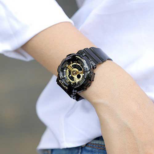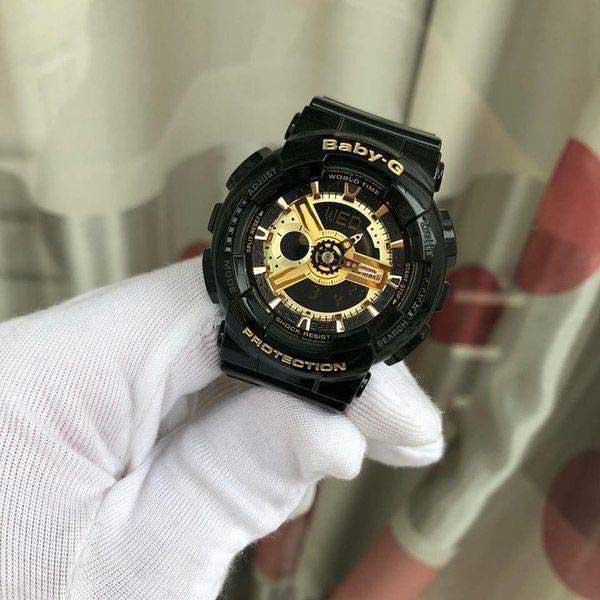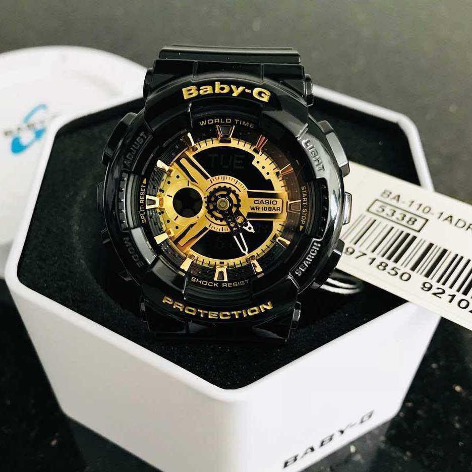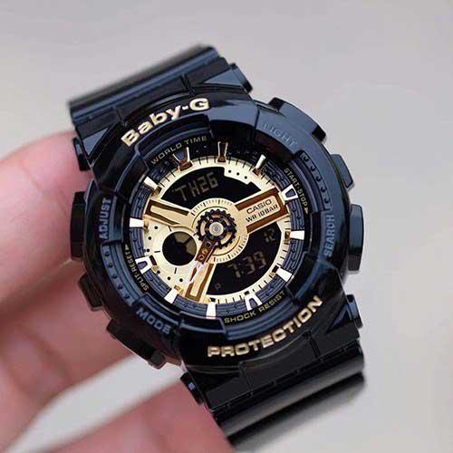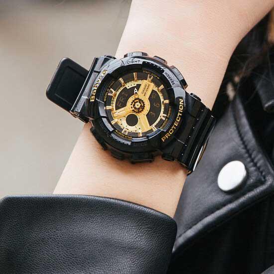 Casio Baby-G đang lớn mạnh với một bộ sưu tập đồng hồ mới được lấy cảm hứng từ “người anh cả” đồng hồ điện tử và kim, G-Shock XL GA110. (Các) mẫu BA110 có dây đeo bằng nhựa bóng, nhẹ với hai màu đen và trắng thời trang, tạo điểm nhấn trên mặt đồng hồ lớn được chải bằng kim loại vàng và vàng hồng nổi bật. BA110 được trang bị mặt kim loại 3D nhiều lớp, cùng với các kim có họa tiết bánh răng, phù hợp với các dấu hiệu kiểu dáng tinh vi của thiết kế công nghiệp. Phụ nữ có thể mang đến sự đẳng cấp cho nơi làm việc với đồng hồ trắng / vàng hồng, trắng / bạc, bạc / bạc và đồng hồ ra mắt với đồng hồ đen / vàng. Đồng hồ kim và đồng hồ kỹ thuật số dây nhựa màu đen với mặt vàng kim loại.