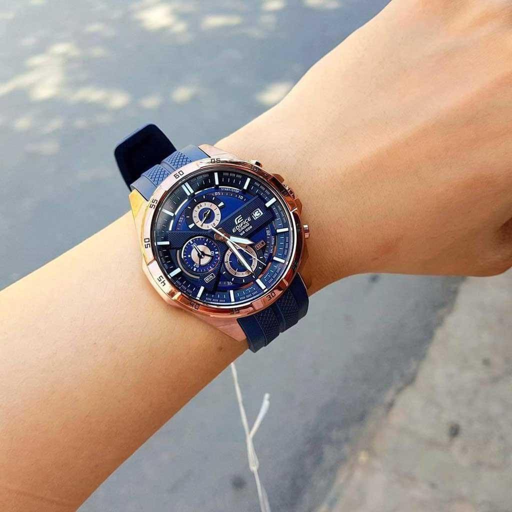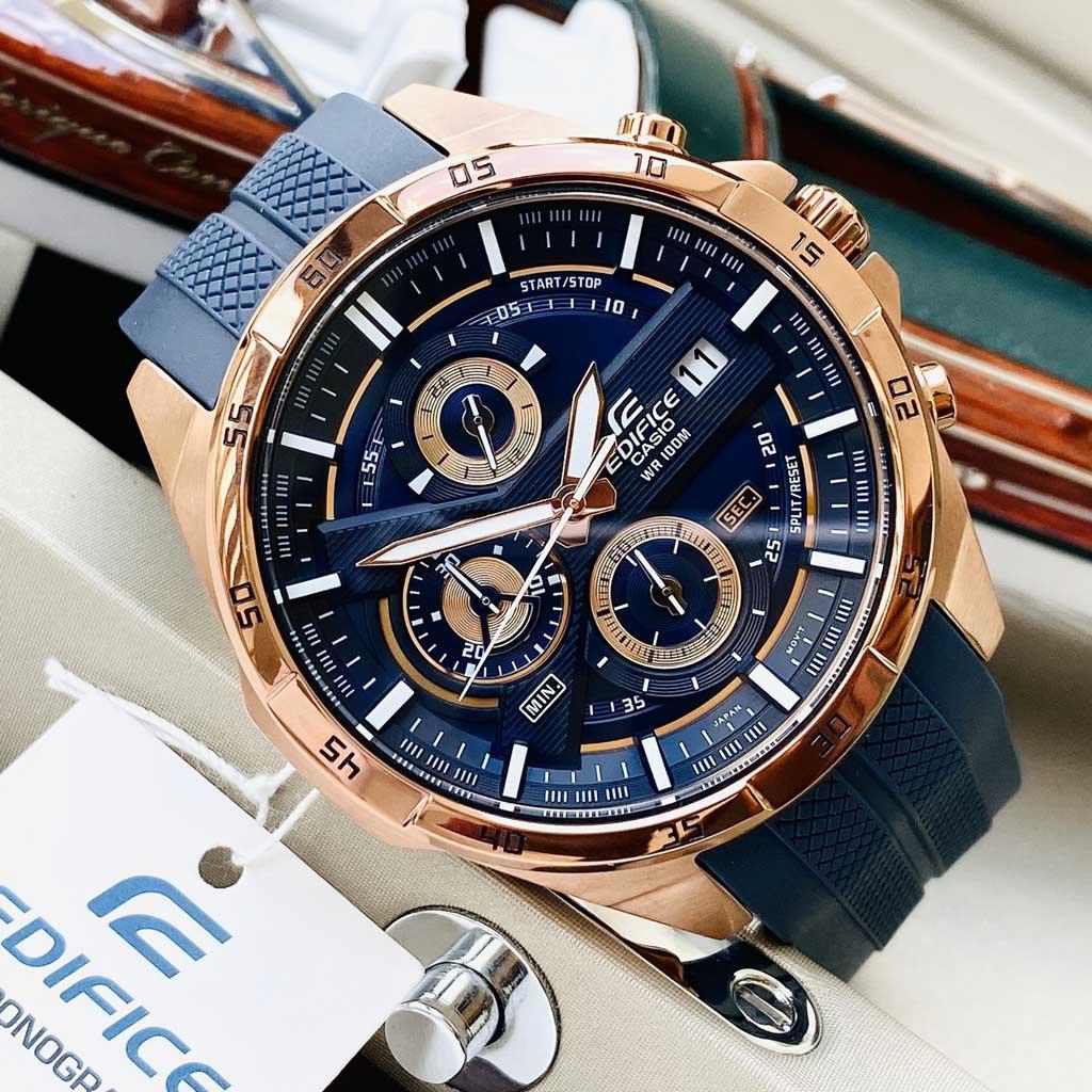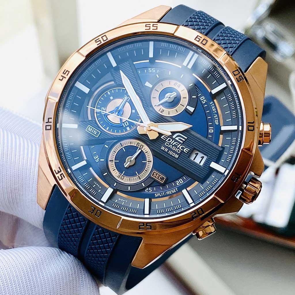 Casio Edifice EFR-556PC-2A Với thiết kế dây nhựa sợi cacbon cao cấp nằm trong bộ sưu tập mới nhất hiện nay. Dòng sản phẩm này được thiết kế đa số dành riêng cho phái mạnh với những chất liệu cao cấp như thép không gỉ cao cấp giúp sản phẩm khá bền bỉ. Sự kết hợp giữa màu xanh navy và các đường vạch mạ vàng hồng nổi trội phiá bên trong mặt đồng hồ.
