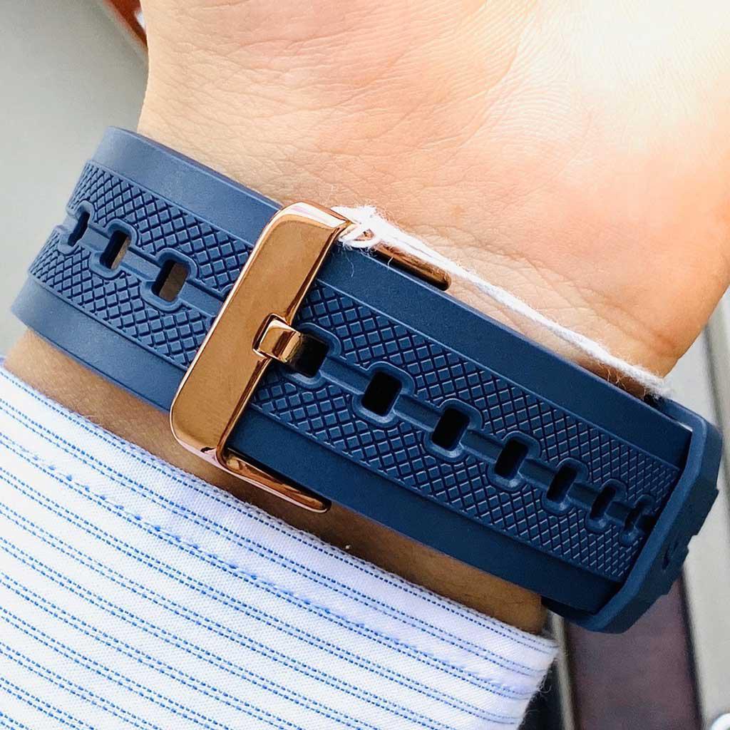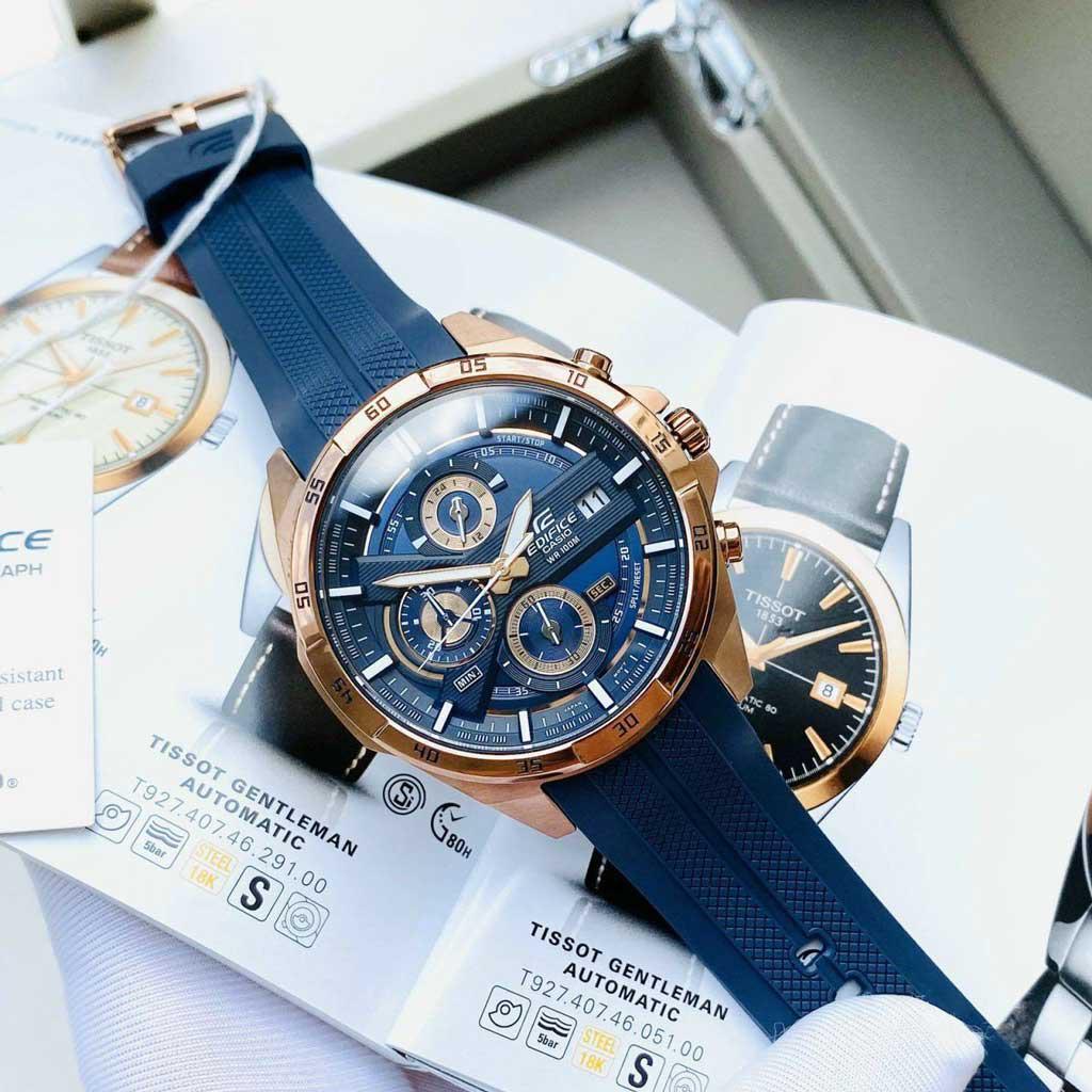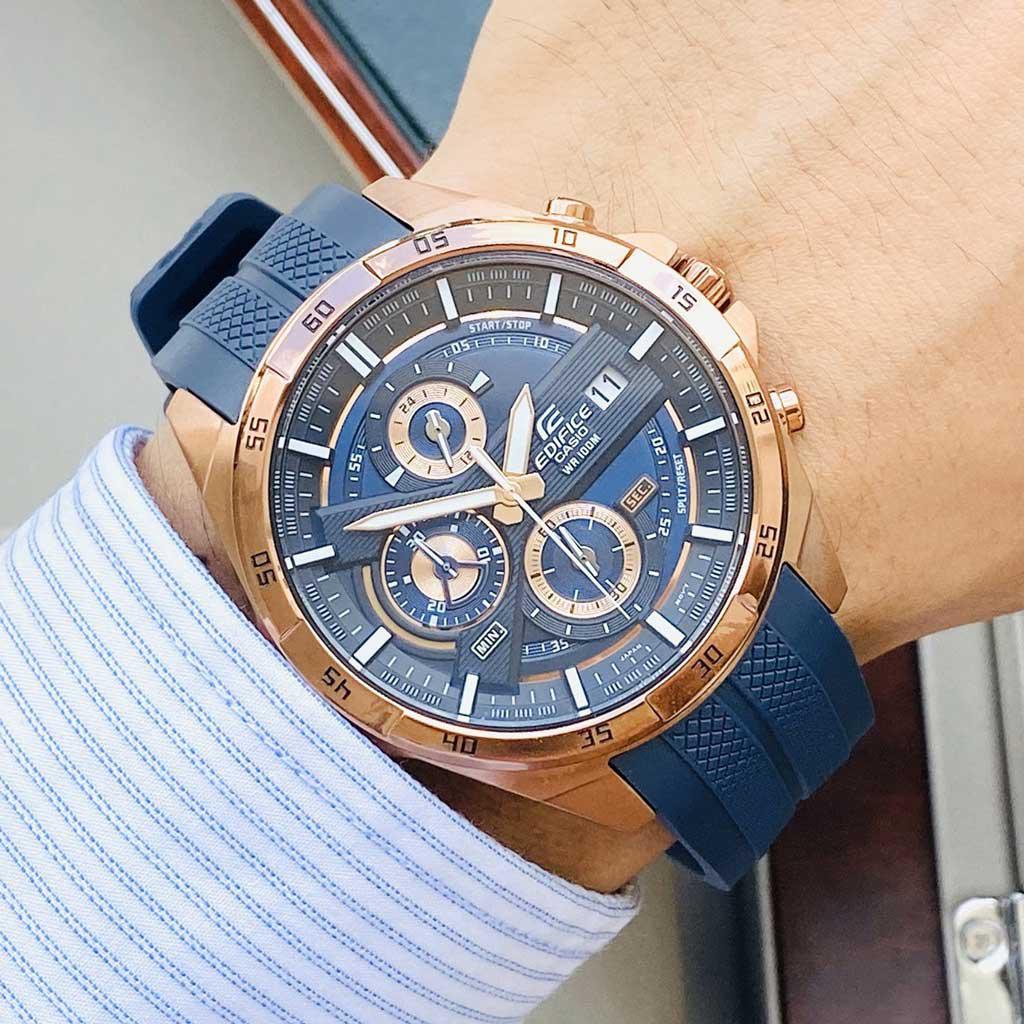 Casio Edifice EFR-556PC-2A Với thiết kế dây nhựa sợi cacbon cao cấp nằm trong bộ sưu tập mới nhất hiện nay. Dòng sản phẩm này được thiết kế đa số dành riêng cho phái mạnh với những chất liệu cao cấp như thép không gỉ cao cấp giúp sản phẩm khá bền bỉ. Sự kết hợp giữa màu xanh navy và các đường vạch mạ vàng hồng nổi trội phiá bên trong mặt đồng hồ.