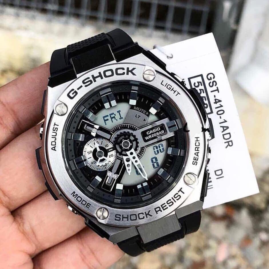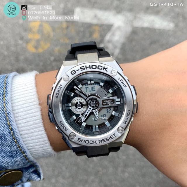 Từ G-SHOCK, thương hiệu đồng hồ không ngừng đặt ra các tiêu chuẩn mới về độ bền đồng hồ hiển thị giờ hiện hành, đã phát triển thiết kế G-STEEL hoàn toàn mới kết hợp các loại chất liệu khác nhau. Mặt đồng hồ của mẫu kim-số này kết hợp đa dạng các bộ phận nhỏ, tạo ra vẻ ngoài của hệ thống bánh răng đa chiều. GST-410 đặc biệt có gờ bằng thép không gỉ chắc chắn trông như bạc và cách phối màu đơn sắc phong cách. Đồng hồ có các tính năng bao gồm bấm giờ 1.000 giờ và chức năng chống từ chuẩn ISO764 giúp bảo vệ đồng hồ không bị nhiễm từ do điện thoại hoặc máy tính phát ra. Đèn LED tự động có độ sáng cao sẽ cung cấp nhiều ánh sáng để dễ đọc trong bóng tối.