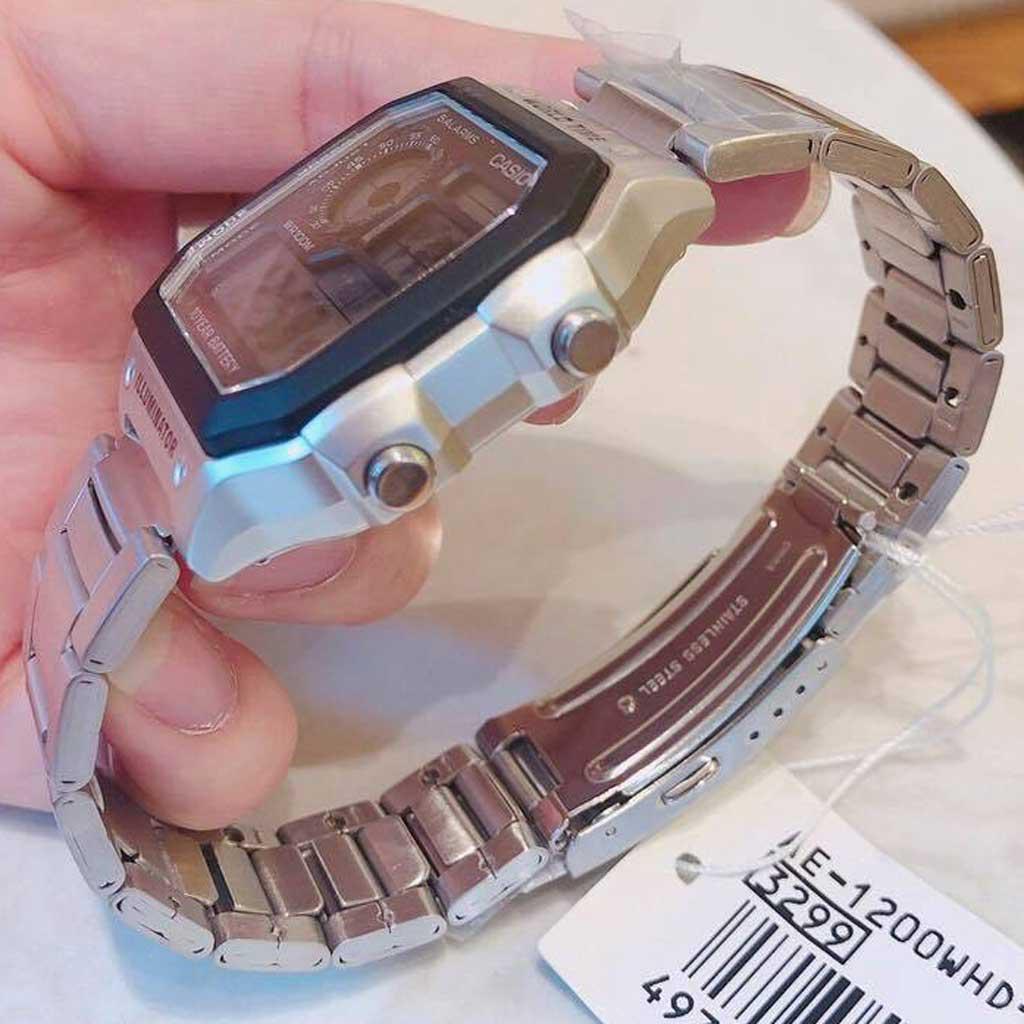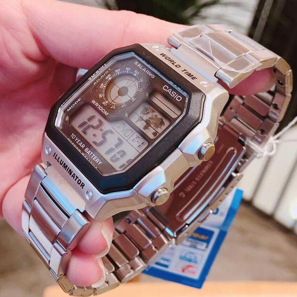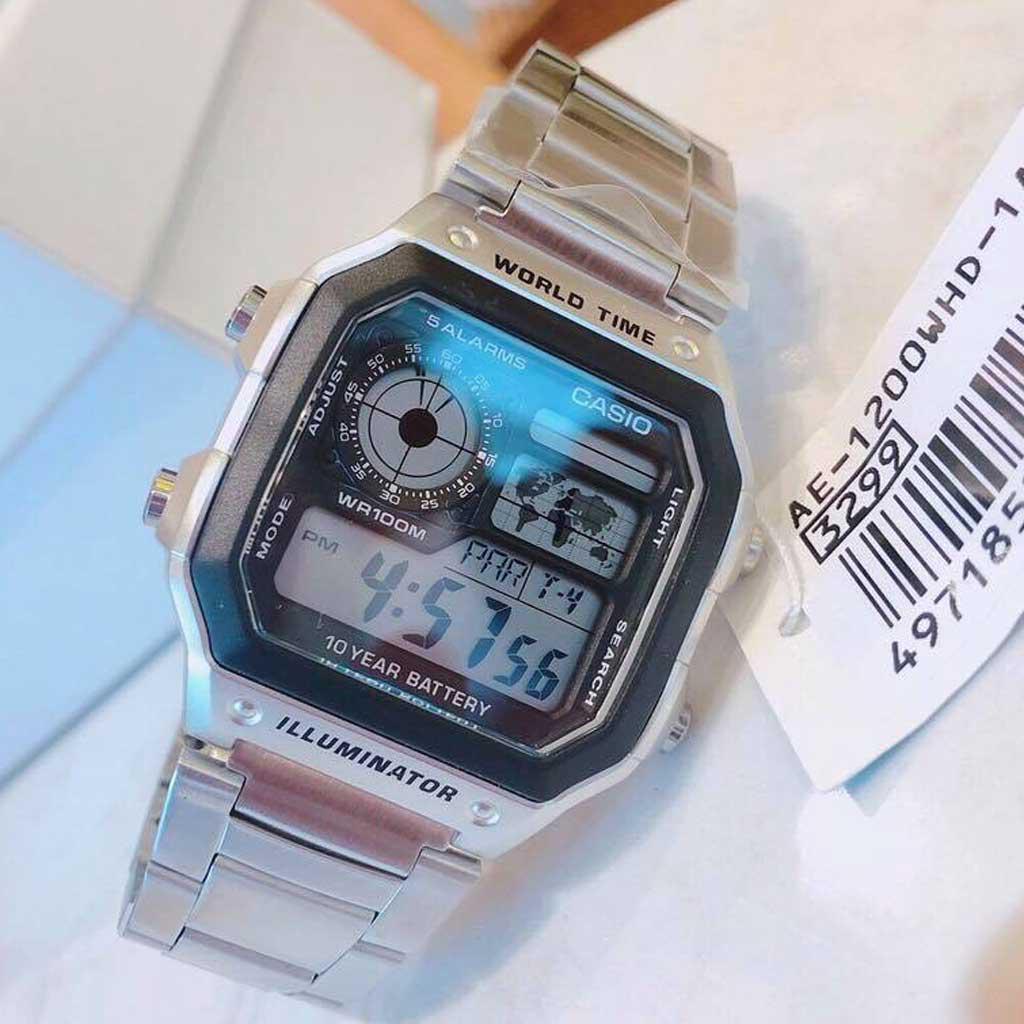 Đồng hồ Casio AE-1200WHD-1AVDF dành cho Nam chức năng world time bản đồ thế giới, chống nước 100m, pin 10 năm, 5 chế độ báo thức, có thể thay từ dây kim loại sang dây da, bảo hành 1 năm với máy, 18 tháng với pin. Đồng hồ Casio Nam AE-1200WHD-1AVDF với thiết kế độc đáo và mới lạ bởi mặt đồng hồ điện tử vuông kết hợp với các chức năng của đồng hồ được hiển thị độc lập và xen kẽ trên màn hình hiển thị sẽ giúp cho người đeo dễ dàng nắm bắt được thời gian và còn giúp cho đồng hồ thêm phần nổi bật và đa dạng. Hơn nưa với thiết kế dây kim loại độc đáo mang lại cho các bạn trai sự trưởng thành và lịch lãm dễ dàng hơn hẳn trong việc phối đồ mà mình yêu thích nhé. Chiếc đồng hồ đeo tay này chính là phần đèn led dùng để chiếu sáng mặt/màn hình đồng hồ. Phần giờ thế giới được hiển thị giờ hiện hành tại các thành phố lớn và các khu vực cụ thể trên thế giới. R:giờ hiện hành tại các thành phố lớn trên thế giới. Con số này cho biết mã số thành phố/khu vực. Đồng hồ thể thao bấm giờ là điểm nổi bật nhất của chiếc đồng hồ này: Đo chính xác thời gian đã trôi qua với 1 lần bấm. Phân số cho biết đơn vị đo chi tiết, trong khi chỉ số thời gian cho biết phép đo thời gian tối đa. Đếm ngược là chức năng ấn tượng của dòng đồng hồ này: Đếm ngược thời gian bắt đầu do bạn chỉ định.Con số cho biết số lần sẵn có, trong khi chỉ số thời gian cho biết thời gian bắt đầu tối đa. Lịch tự động hoàn toàn: Cho phép tự động sắp xếp tháng có độ dài khác nhau, bao gồm cả năm nhuận. Bạn có thể lựa chọn được kiểu hiển thị là 12h hoặc là kiểu 24h. Bạn có thể Bật/tắt âm khi thao tác:Có thể bật và tắt âm vang lên để báo hiệu sự thay đổi chế độ hay thao tác khác. Bạn biết đấy đồng hồ Casio luôn được mệnh danh là dòng đồng hồ có khả năng chống nước tốt. Trên đồng hồ Casio có chữ BAR cho biết số đơn vi áp suất mà tính năng chống nước của đồng hồ có thể chịu được. 10 Bar nghĩa là có thể chống nước tới 10 đơn vị áp suất <=>(100m) . Dòng đồng hồ Casio có chức năng báo thức giúp bạn có thể báo thức hằng ngày, báo theo giờ: Báo thức hằng ngày vang lên mỗi ngày vào giờ bạn đã cài đặt. Con số cho biết bao nhiêu lần báo thức có thể vào mỗi ngày. Điểm tuyệt vời nhất của chiếc đồng hồ này chính là tuổi thọ pin: Pin kéo dài ít nhất 10 năm. Đặc biệt là mặt kính bằng nhựa nguyên chất có khả năng chống va đập chống xước, chống nước cực tốt có thể bảo vệ được bộ máy bên trong.