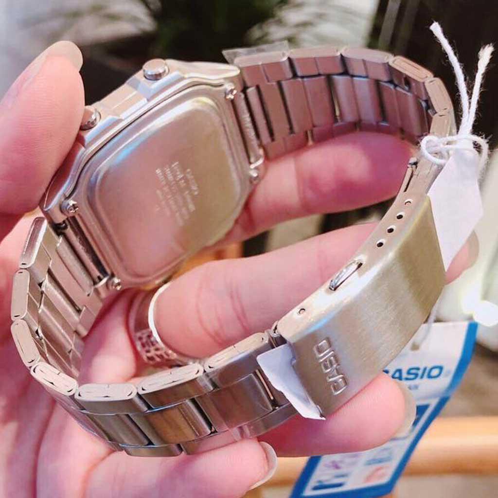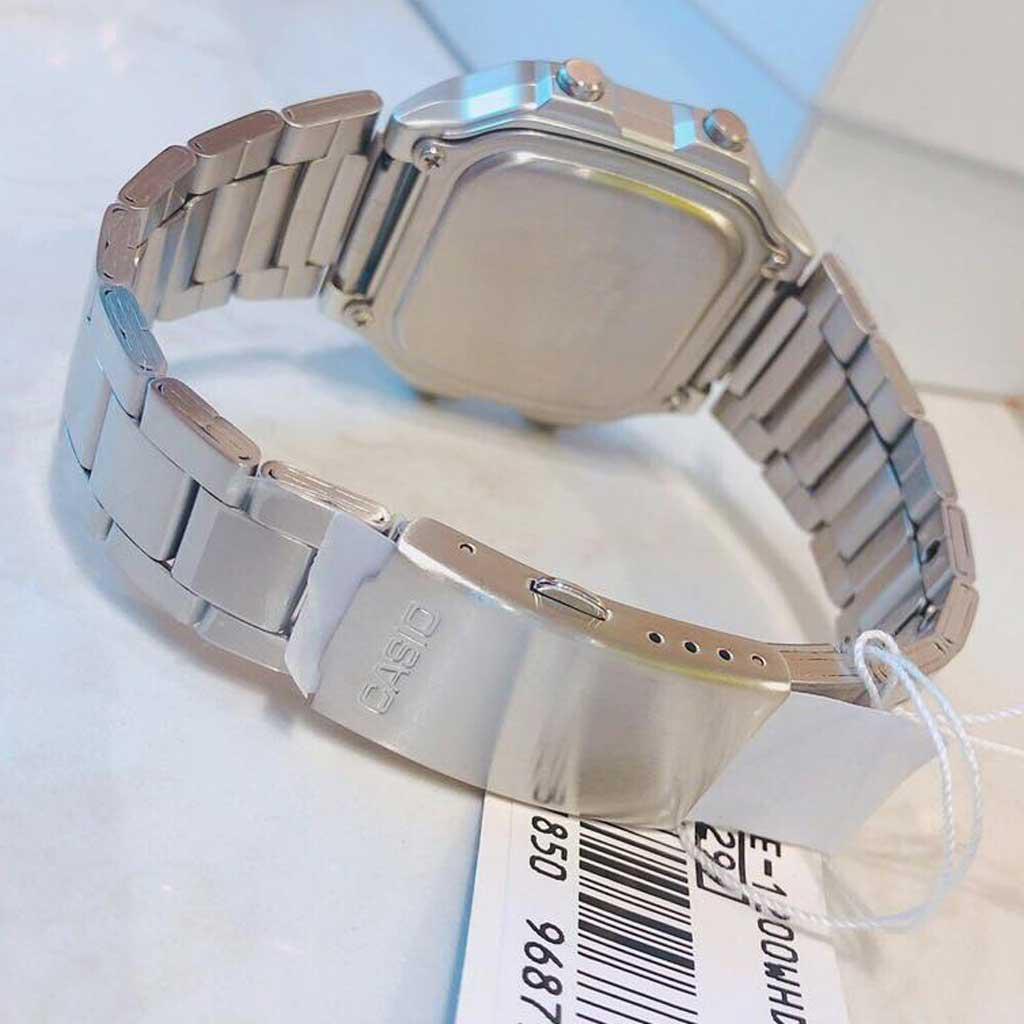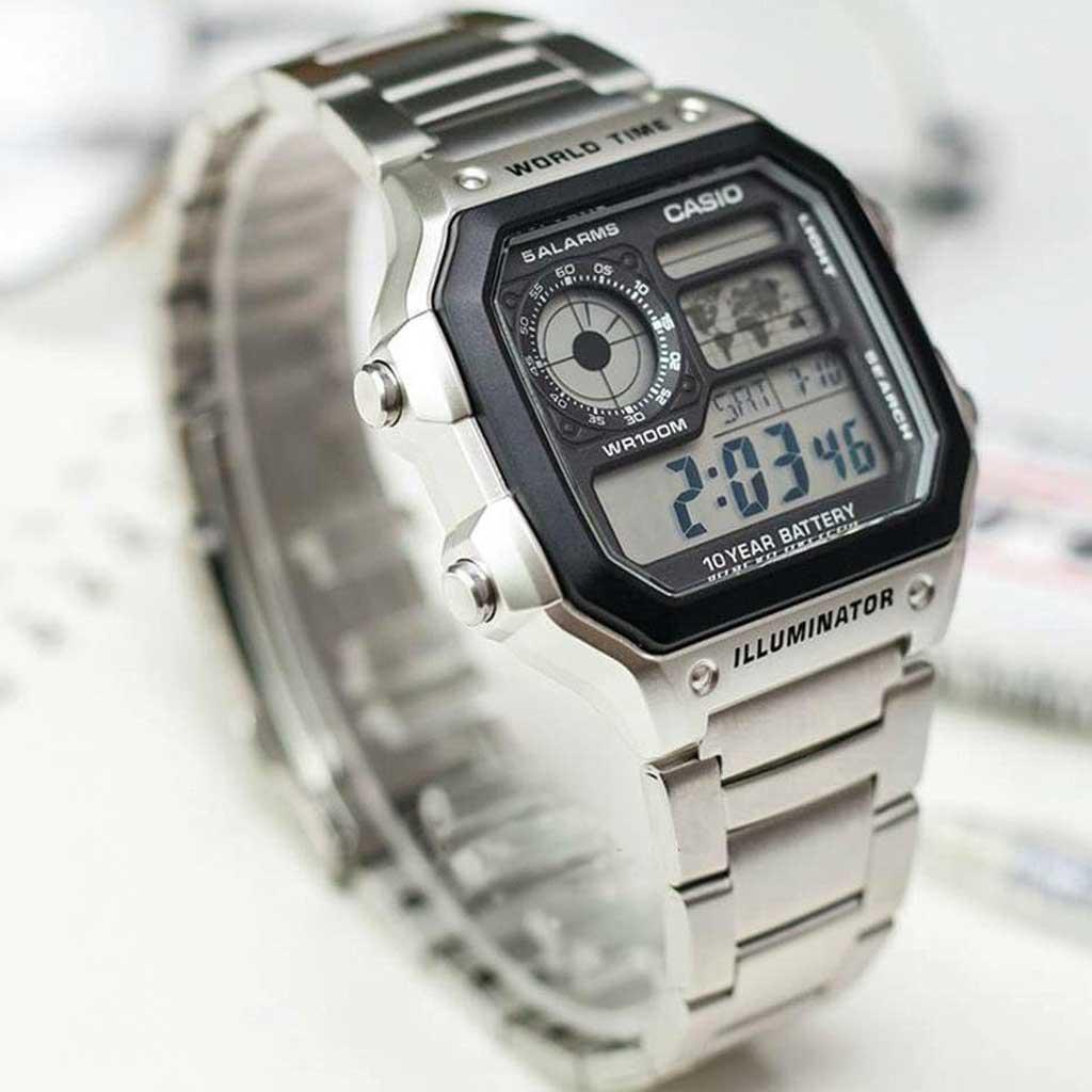 Đồng hồ Casio AE-1200WHD-1AVDF dành cho Nam chức năng world time bản đồ thế giới, chống nước 100m, pin 10 năm, 5 chế độ báo thức, có thể thay từ dây kim loại sang dây da, bảo hành 1 năm với máy, 18 tháng với pin. Đồng hồ Casio Nam AE-1200WHD-1AVDF với thiết kế độc đáo và mới lạ bởi mặt đồng hồ điện tử vuông kết hợp với các chức năng của đồng hồ được hiển thị độc lập và xen kẽ trên màn hình hiển thị sẽ giúp cho người đeo dễ dàng nắm bắt được thời gian và còn giúp cho đồng hồ thêm phần nổi bật và đa dạng. Hơn nưa với thiết kế dây kim loại độc đáo mang lại cho các bạn trai sự trưởng thành và lịch lãm dễ dàng hơn hẳn trong việc phối đồ mà mình yêu thích nhé. Chiếc đồng hồ đeo tay này chính là phần đèn led dùng để chiếu sáng mặt/màn hình đồng hồ. Phần giờ thế giới được hiển thị giờ hiện hành tại các thành phố lớn và các khu vực cụ thể trên thế giới. R:giờ hiện hành tại các thành phố lớn trên thế giới. Con số này cho biết mã số thành phố/khu vực. Đồng hồ thể thao bấm giờ là điểm nổi bật nhất của chiếc đồng hồ này: Đo chính xác thời gian đã trôi qua với 1 lần bấm. Phân số cho biết đơn vị đo chi tiết, trong khi chỉ số thời gian cho biết phép đo thời gian tối đa. Đếm ngược là chức năng ấn tượng của dòng đồng hồ này: Đếm ngược thời gian bắt đầu do bạn chỉ định.Con số cho biết số lần sẵn có, trong khi chỉ số thời gian cho biết thời gian bắt đầu tối đa. Lịch tự động hoàn toàn: Cho phép tự động sắp xếp tháng có độ dài khác nhau, bao gồm cả năm nhuận. Bạn có thể lựa chọn được kiểu hiển thị là 12h hoặc là kiểu 24h. Bạn có thể Bật/tắt âm khi thao tác:Có thể bật và tắt âm vang lên để báo hiệu sự thay đổi chế độ hay thao tác khác. Bạn biết đấy đồng hồ Casio luôn được mệnh danh là dòng đồng hồ có khả năng chống nước tốt. Trên đồng hồ Casio có chữ BAR cho biết số đơn vi áp suất mà tính năng chống nước của đồng hồ có thể chịu được. 10 Bar nghĩa là có thể chống nước tới 10 đơn vị áp suất <=>(100m) . Dòng đồng hồ Casio có chức năng báo thức giúp bạn có thể báo thức hằng ngày, báo theo giờ: Báo thức hằng ngày vang lên mỗi ngày vào giờ bạn đã cài đặt. Con số cho biết bao nhiêu lần báo thức có thể vào mỗi ngày. Điểm tuyệt vời nhất của chiếc đồng hồ này chính là tuổi thọ pin: Pin kéo dài ít nhất 10 năm. Đặc biệt là mặt kính bằng nhựa nguyên chất có khả năng chống va đập chống xước, chống nước cực tốt có thể bảo vệ được bộ máy bên trong.