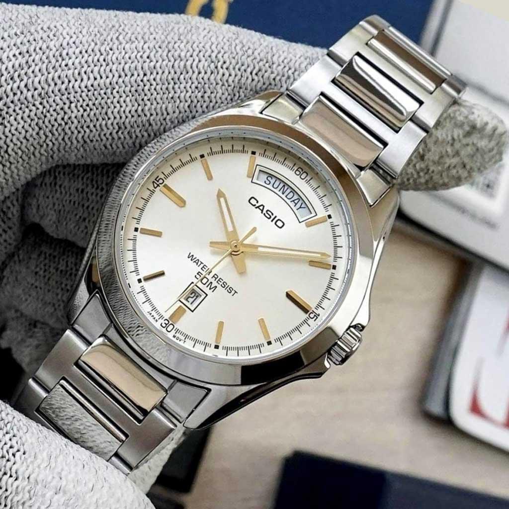 Đồng hồ nam chính hãng MTP-1370D-9AVDF đường kính 40 mm, bề dày 8.8 mm. Đây là size mặt tầm trung phù hợp với cổ tay của đại đa số anh em Châu Á. Điểm nhấn cho nhân vật chính chính là lịch ngày và thứ nằm đối diện với nhau ở góc 6 và 12 giờ. Cách thiết kế sáng tạo mà ít mẫu đồng hồ nào có được nên trông MTP-1370D-9AVDF khá lạ. Cái tôi cá tính, độc đáo được thể hiện ngay trên nền mặt vàng cát, nhẹ nhàng mà cuốn hút. Sự hài hòa bật trên 12 cọc kim loại tại các vị trí giờ. Đồng điệu một cách tinh tế với 3 kim chỉ giờ được mài giũa chỉnh chu. Dây và vỏ của MTP-1370D-9AVDF được hoàn thiện bởi thép không gỉ với độ bền cao trong sử dụng. Có thể nói đây cũng chính là lí do mà nhiều anh em lựa chọn gương mặt này. Độ bền cao, không khó chịu khi ra mồ hôi.