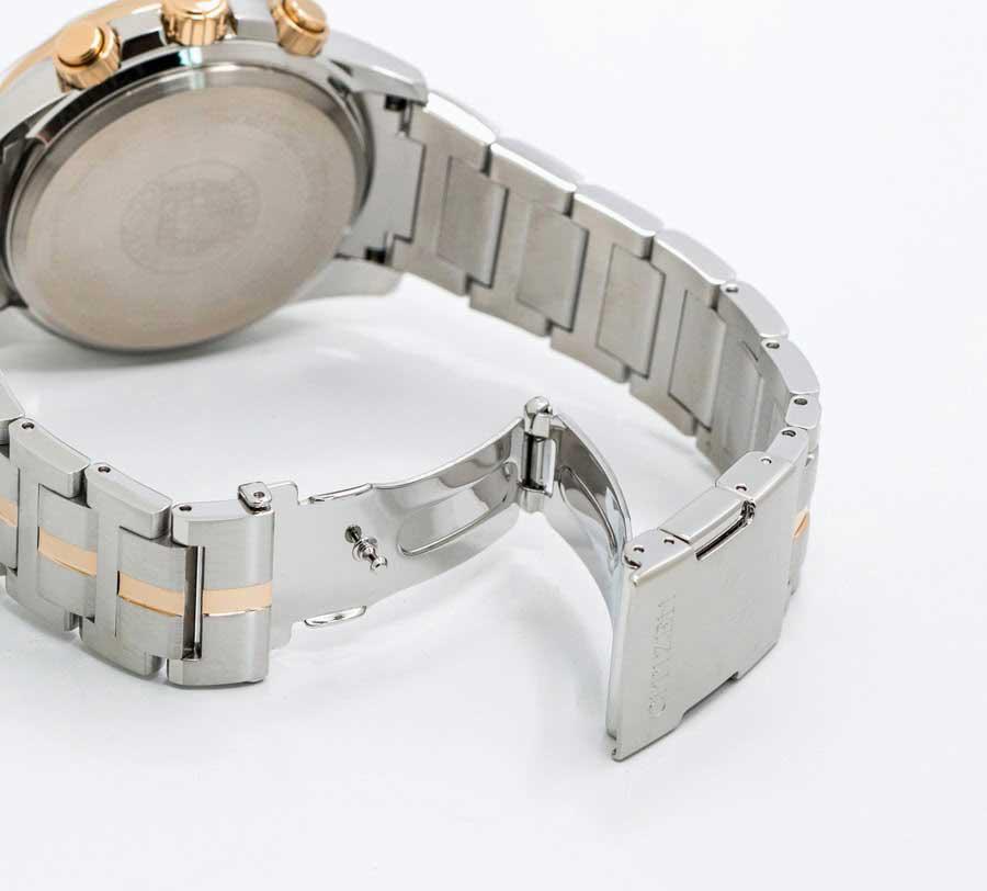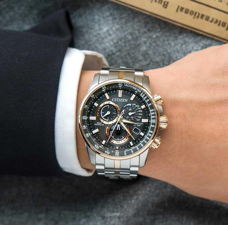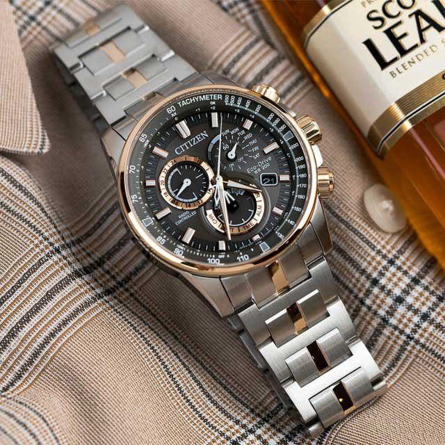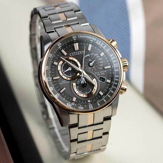 Chiếc đồng hồ Citizen Eco-Drive dành cho nam này thuộc Bộ sưu tập Perpetual Chrono A-T, hoặc PCAT, đồng bộ hóa với đồng hồ nguyên tử để có độ chính xác cực cao trong khi cũng có thiết kế thể thao, táo bạo. Chiếc đồng hồ này có vỏ thép không gỉ 43mm hai tông màu, có mặt số màu xám than với kim và vạch giờ màu vàng hồng phát sáng. Đồng hồ bấm giờ đa chức năng này cũng bao gồm lịch vạn niên, thời gian 12/24 giờ, báo thức, máy đo tốc độ và hiển thị ngày tháng. Đồng hồ này chắc chắn với một tông màu vàng hồng và dây đeo bằng thép không gỉ, đồng thời tự hào có công nghệ Eco-Drive cho phép đồng hồ của bạn sạc dưới mọi ánh sáng, loại bỏ nhu cầu sử dụng pin.