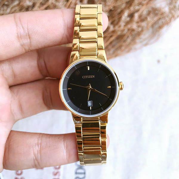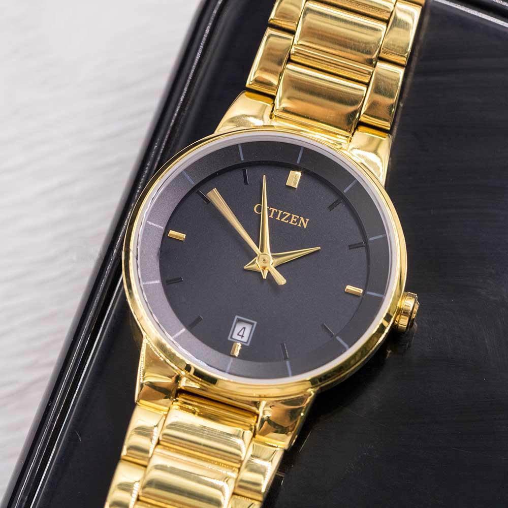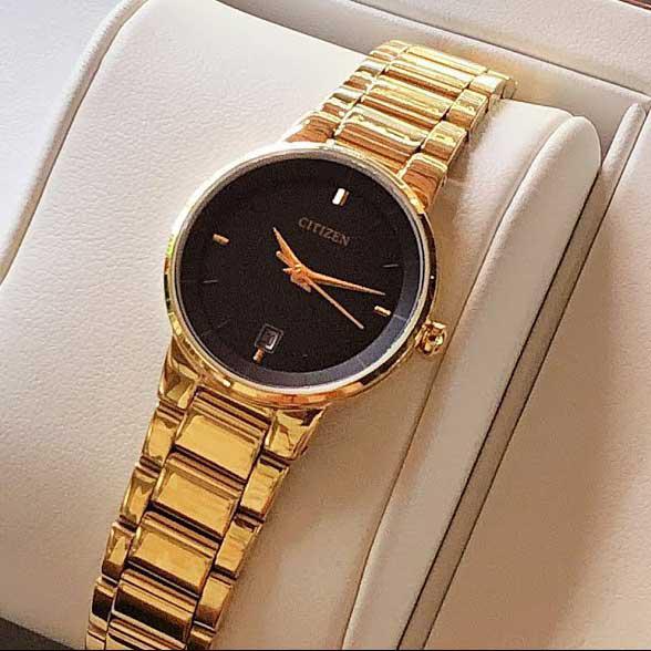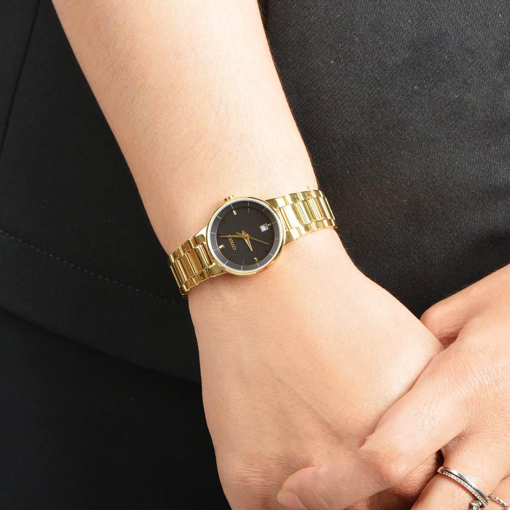 Citizen EU6012-58E xuất hiện với chiếc mặt tròn nhỏ xinh cùng kích thước đường kính là 27mm. Nằm gọn gàng trên cổ tay của nàng mà không gây quá nhiều trở ngại hay vướng víu khi hoạt động mà lại tạo cho nàng cảm giác vô cùng thoải mái. Với gam màu đen đầy quyền lực và cũng làm nền để giúp bộ kim và cọc số trở nên nổi bật hơn, người dùng sẽ dễ dàng quan sát thời gian hơn. Những cọc số được phủ vàng tại những vị trí lần lượt là 3,6,9,12 vừa là một điểm nhấn, vừa phá tan đi lối lặp lại vốn gây nhàm chán cho người dùng. Tại vị trí 6 giờ, một bộ lịch ngày được đặt với kích thước nhỏ gọn, không chiếm quá nhiều diện tích với nhiệm vụ mang đến nàng sự chủ động để có thể sắp xếp các công việc hằng ngày cách hợp lý. Lớp bảo vệ trên Citizen EU6012-58E lần này được sử dụng mặt kính cứng Mineral Crystal và khung niềng thép không gỉ 316L. Đây là hai chất liệu có thể xem là hoàn hảo trong phân khúc giá bình dân bởi chất lượng cũng như mức giá thành. Về chất lượng thì không cần phải bàn cãi, cả hai đều dẫn đầu trong khả năng chịu lực cũng như chống va đập, nhờ vậy mà sản phẩm gần như không bị hề hấn gì trước những tác động không đáng có. Đặc biệt với đồng hồ kính cứng còn dễ dàng đánh bóng để có thể duy trì được vẻ đẹp như mới. Hiện nay dịch vụ này cũng đang được phục vụ tại hệ thống SightVN với mức chi phí hạt dẻ. Nếu nàng là một cô gái ưa chuộng sự hoàn hảo thì đừng quên trải nghiệm dịch vụ này nhé.