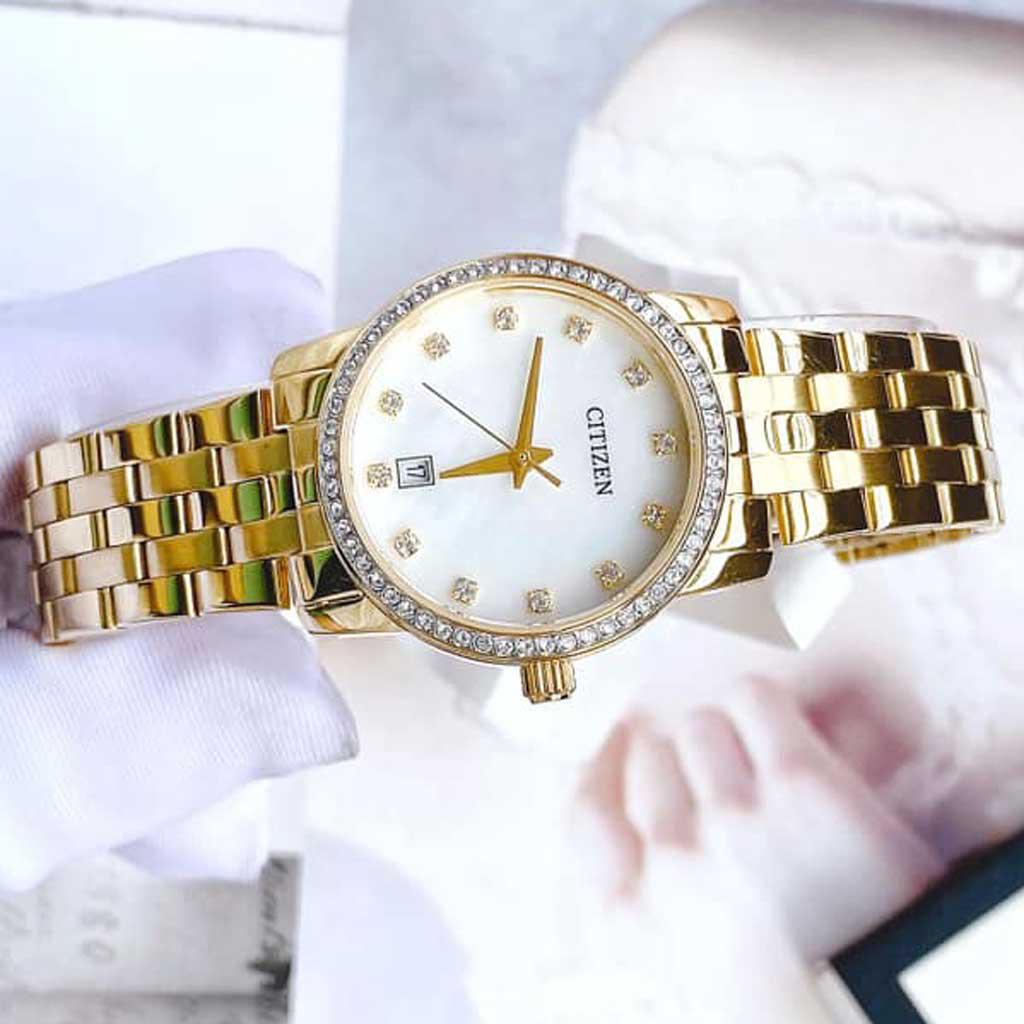 Khi bạn nhìn vào chiếc đồng hồ Citizen EU6032-51D này, đập vào mắt bạn đó là một màu vàng sang trọng. Bộ vỏ được làm bằng thép không gỉ 316L mạ vàng PVD nhìn là yêu ngay được. Kết hợp với núm xoay cũng được mạ vàng nhìn rất đồng điệu. Trên mặt đồng hồ còn được đính những viên pha lê lấp lánh xung quanh vòng bezel của bộ vỏ tạo nên một sự kiêu sa khó cưỡng. Dây đeo của chiếc đồng hồ này cũng được làm từ thép không gỉ 316L và được mạ vàng PVD để đồng màu với bộ vỏ. Thực sự cảm quan bên ngoài rất rất đẹp mắt và sang trọng. Mặt số bên trong được khảm trai tạo nên vẻ đẹp liêu trai mà bạn hằng mơ ước. Còn gì đẹp bằng vẻ đẹp của ngọc trai. Các kim đồng hồ được làm sắc sảo và cũng có màu vàng tương đồng với bộ vỏ và dây đeo tạo nên sự nhấn nhá trong thiết kế của mặt đồng hồ. Nhưng chưa hết, ở các vị trí chia giờ thì Citizen đã đính những viên pha lê sáng lấp lánh đẹp mê hồn. Đây chính là điểm khác biệt tạo nên sự sang trọng và đẳng cấp của Citizen EU6032-51D.