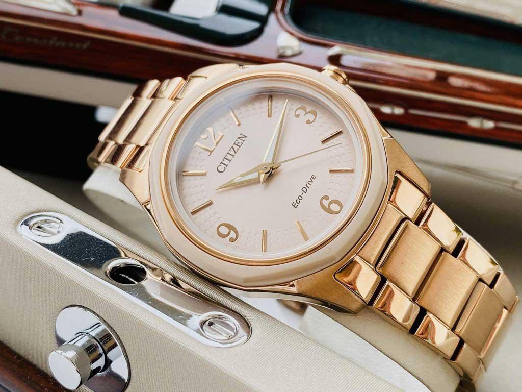 Phiên bản Citizen FE7053-51X máy pin với trang bị công nghệ Eco-Drive (Năng Lượng Ánh Sáng), tone vàng hồng thời trang sang trọng được phối trên phần dây vỏ đồng hồ.
