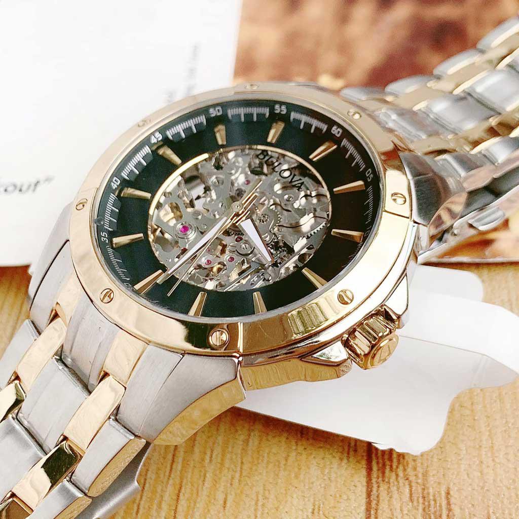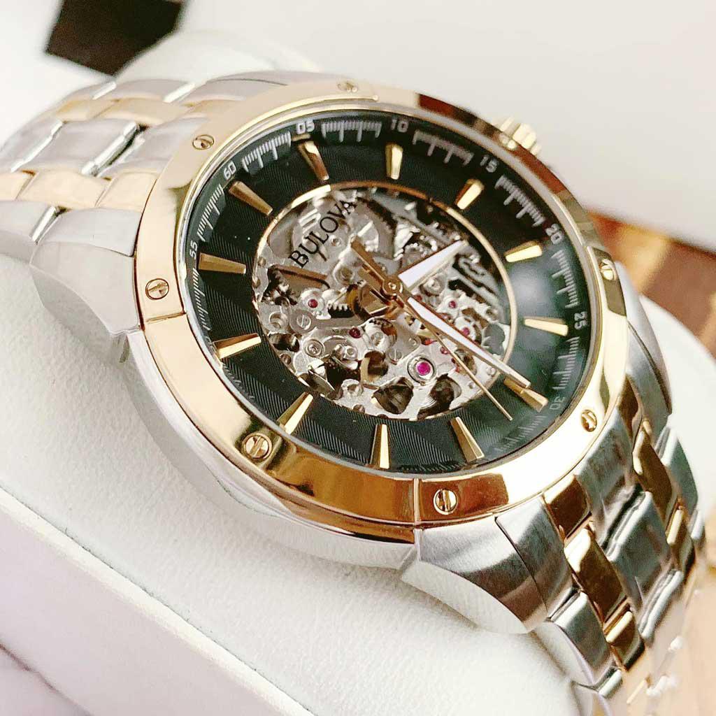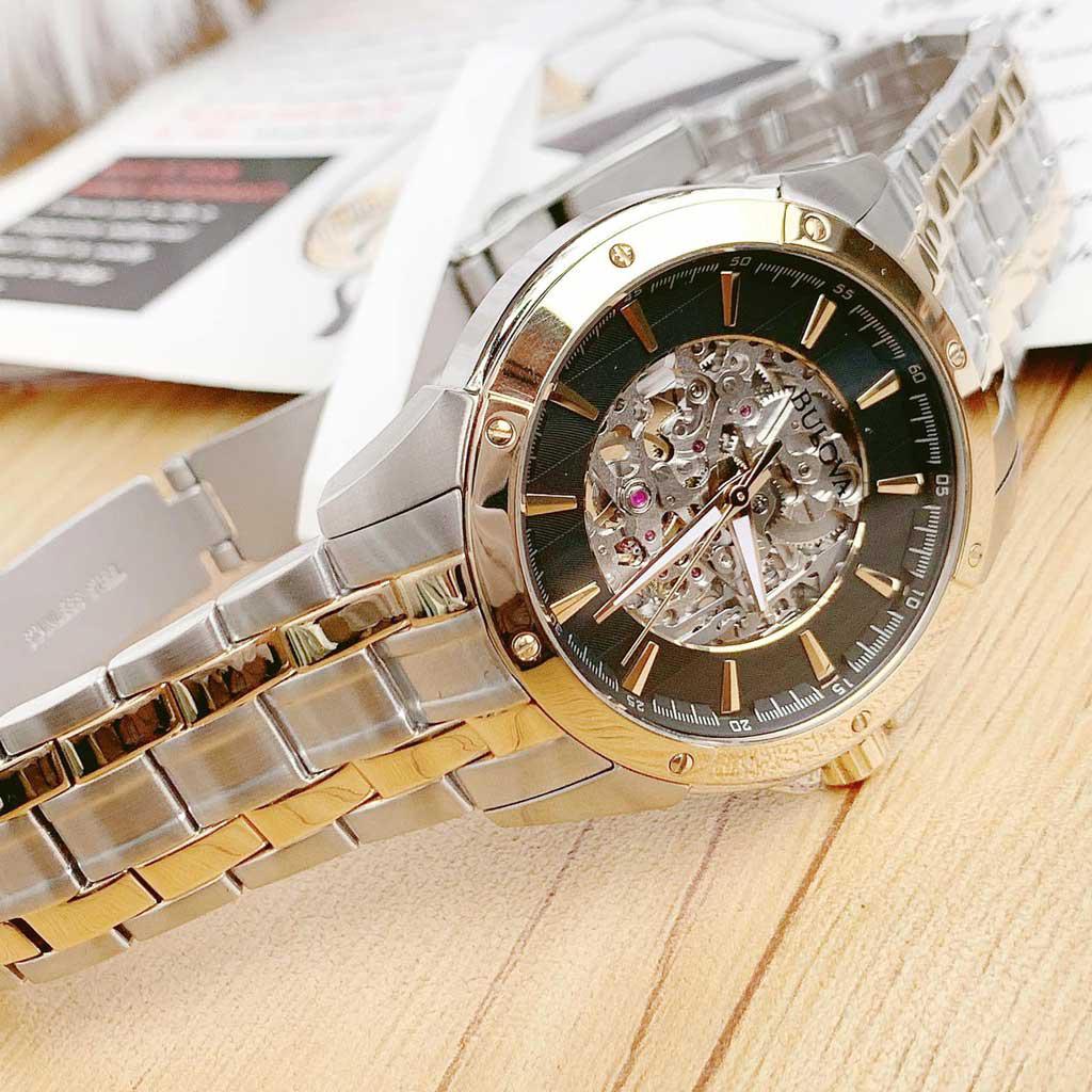 Bulova 98A146 thiết kế lộ cơ đẹp hoàn hảo và cực sang với tông màu đen – vàng ở mặt đồng hồ kết hợp với dây kim loại sáng.