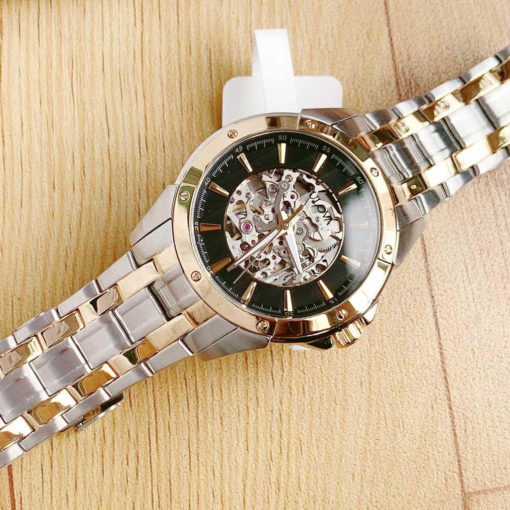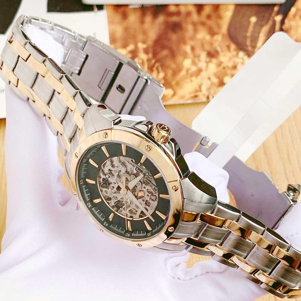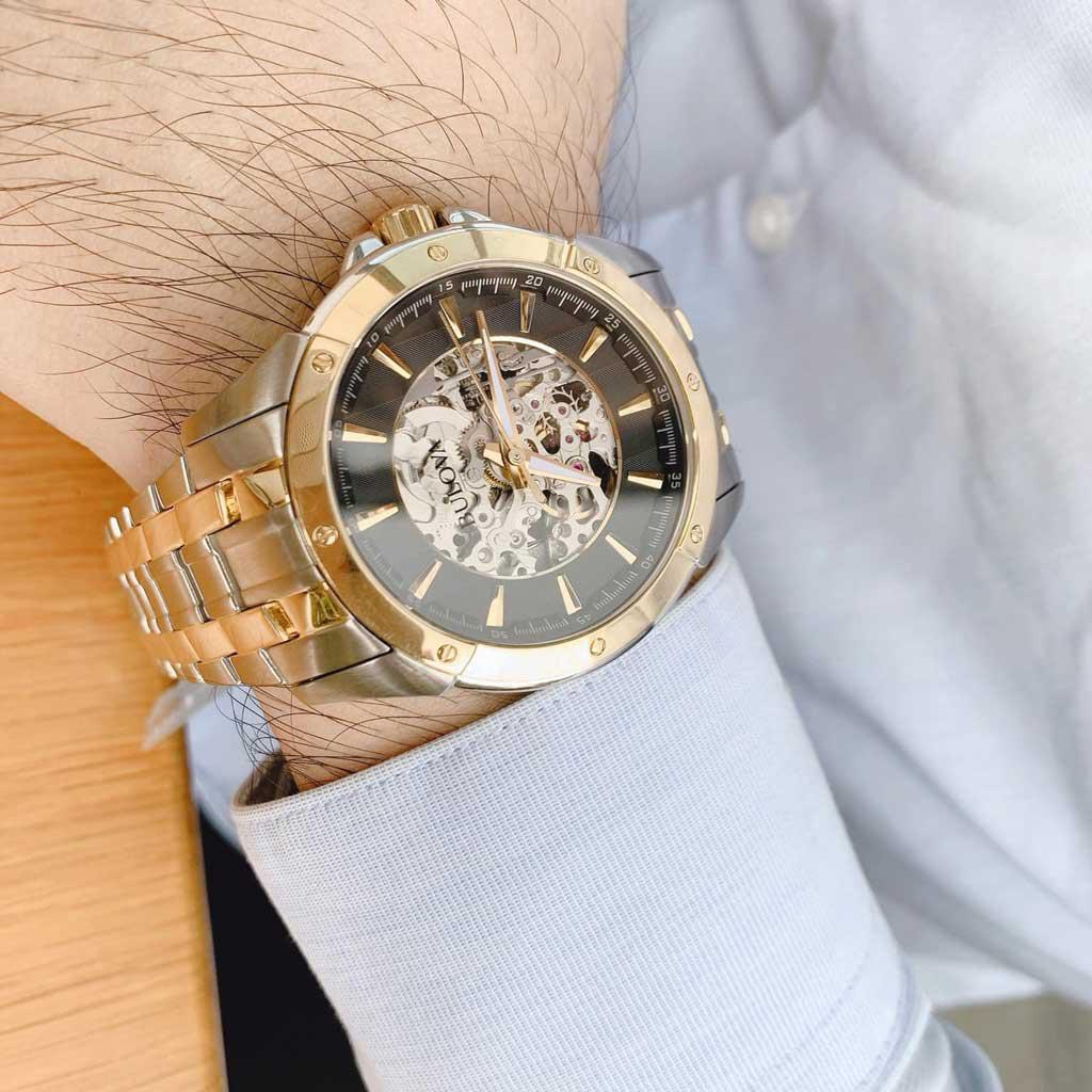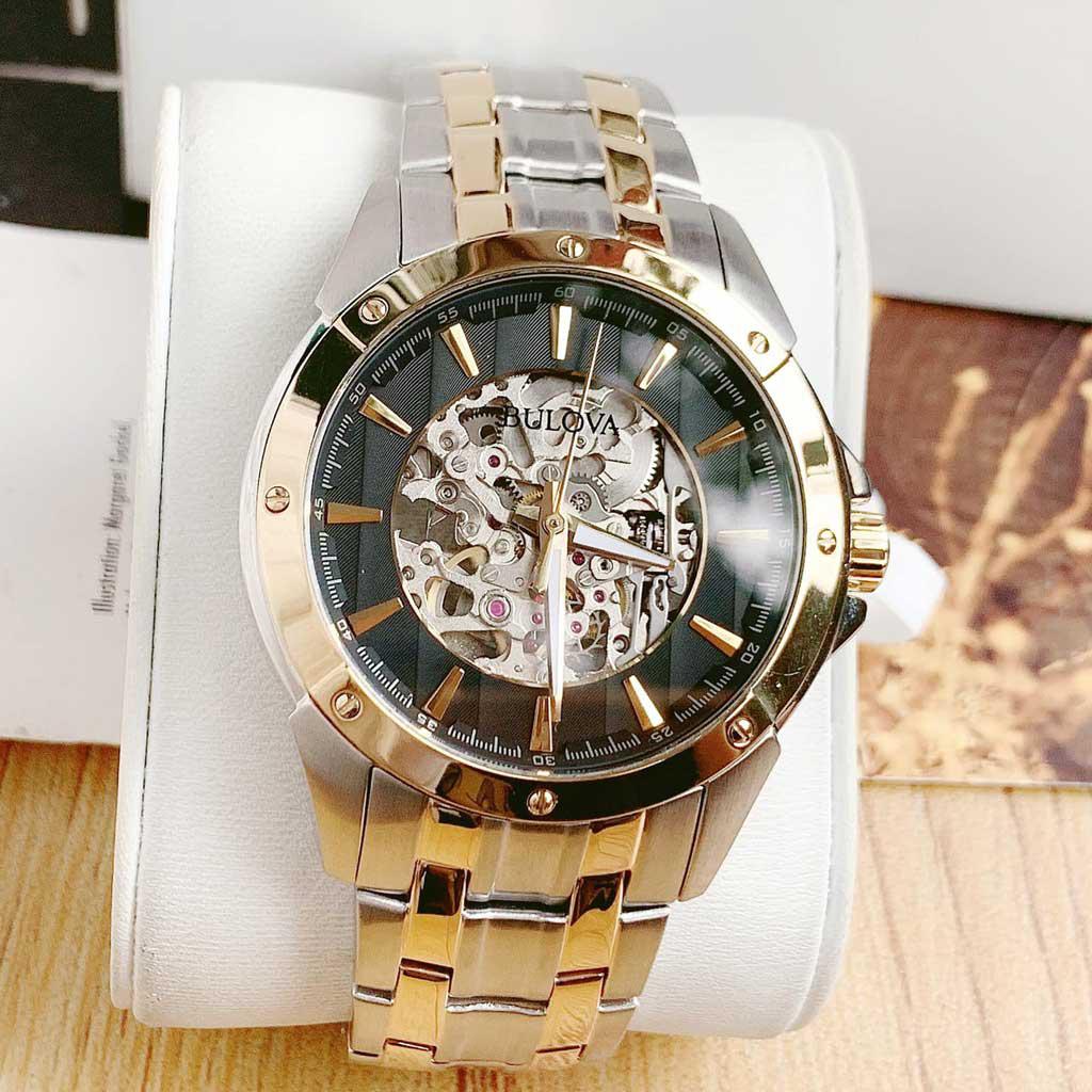 Bulova 98A146 thiết kế lộ cơ đẹp hoàn hảo và cực sang với tông màu đen – vàng ở mặt đồng hồ kết hợp với dây kim loại sáng.