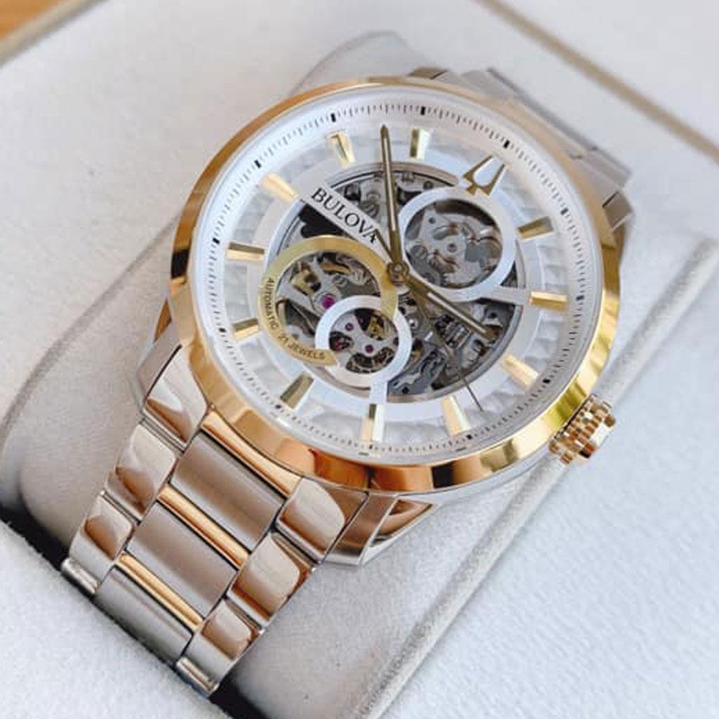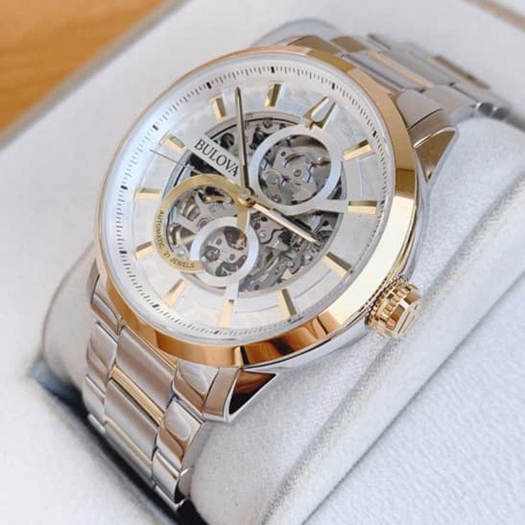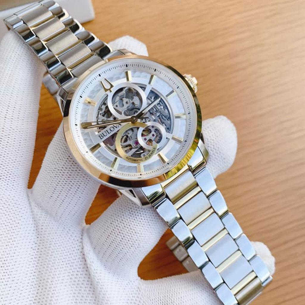 Ẩn bên dưới mặt kính mẫu đồng hồ Bulova 98A214 Automatic mang đến 1 vẻ ngoài độc đáo cùng mặt số chân kính trong suốt phô diễn ra 1 phần bên trong của bộ máy cơ đầy thu hút.