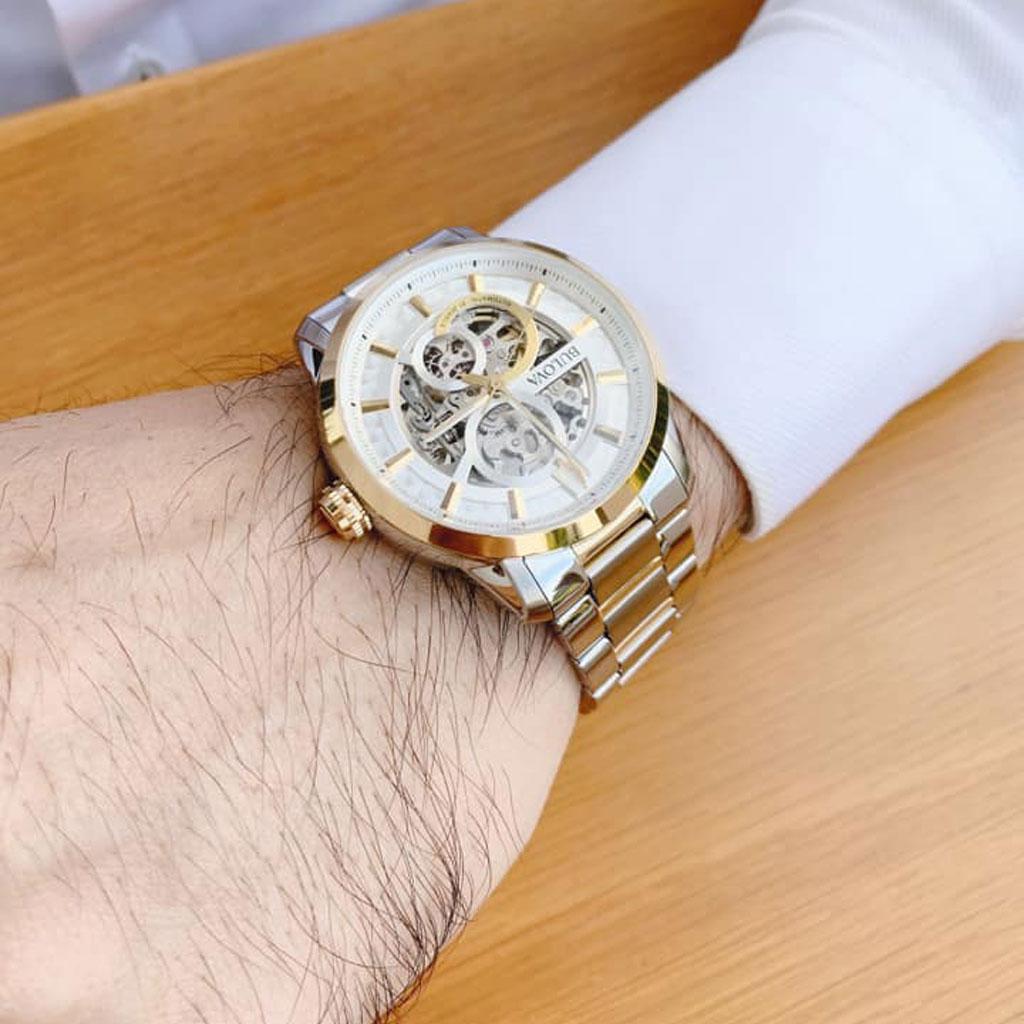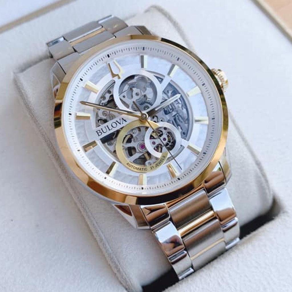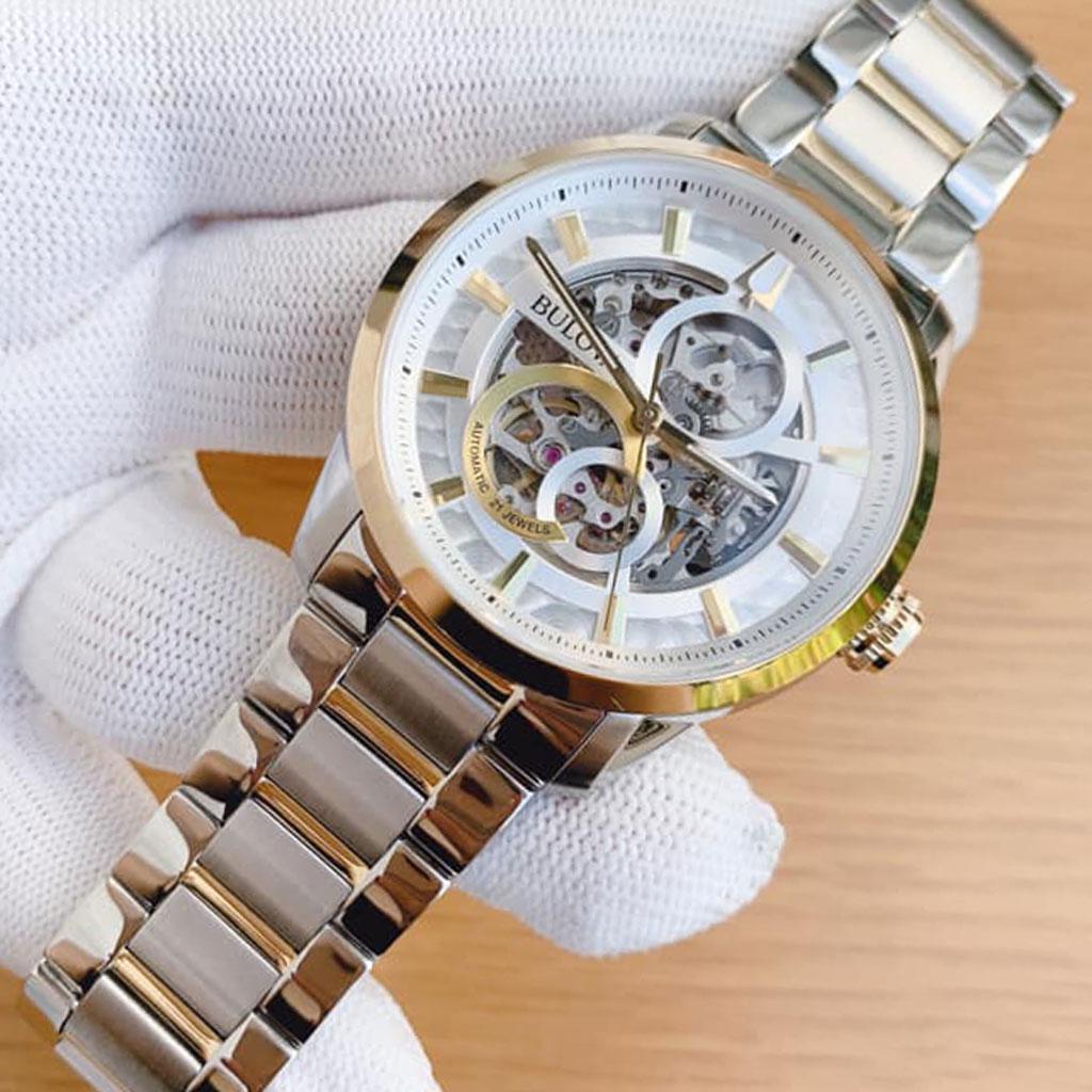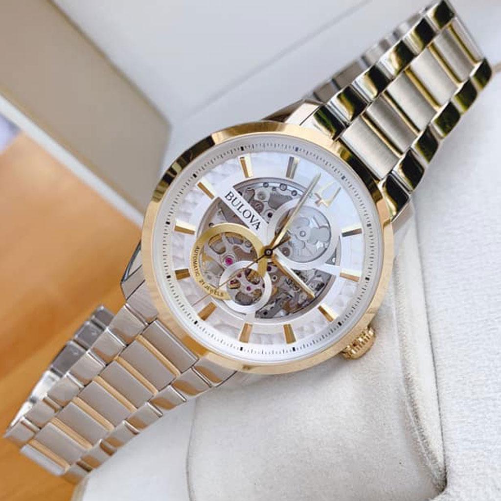 Ẩn bên dưới mặt kính mẫu đồng hồ Bulova 98A214 Automatic mang đến 1 vẻ ngoài độc đáo cùng mặt số chân kính trong suốt phô diễn ra 1 phần bên trong của bộ máy cơ đầy thu hút.