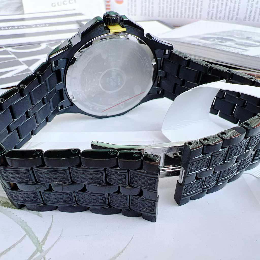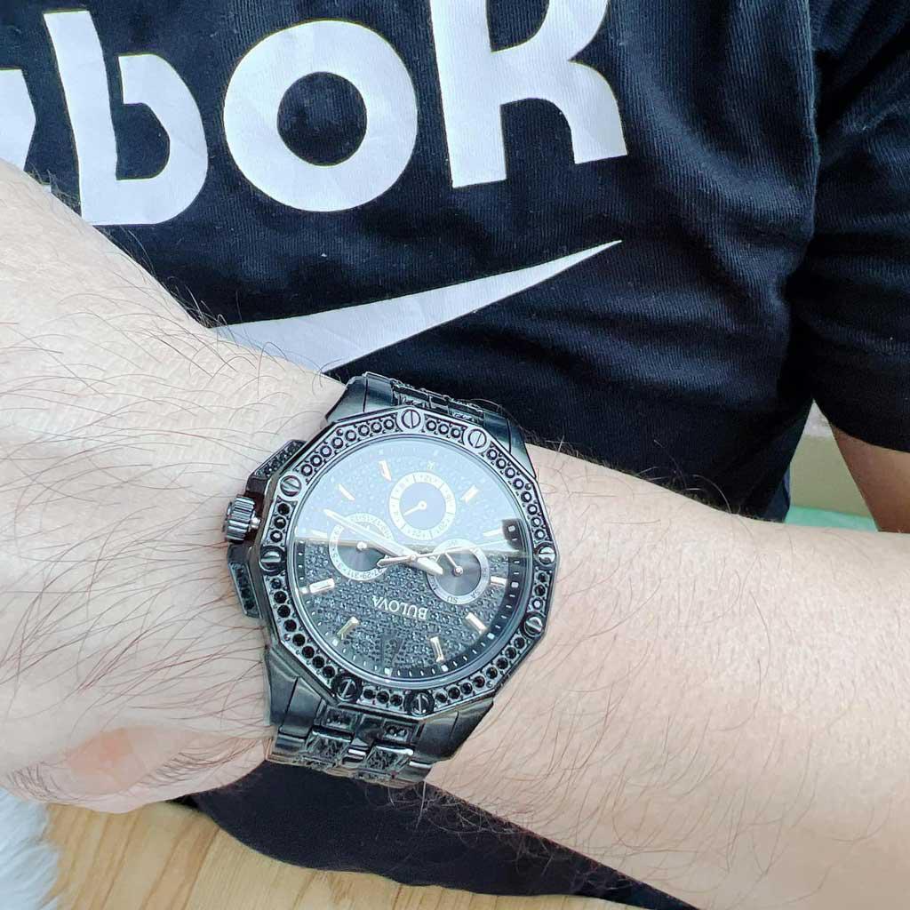 Chiếc đồng hồ đa chức năng được tô điểm một cách táo bạo với 300 viên pha lê trên vỏ và dây đeo bằng thép không gỉ tông màu đen với mặt số màu đen nổi bật. Khả năng chống nước đến 30 mét.