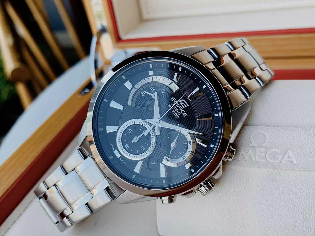 Đồng hồ Casio Edifice EFV-580D-7AV được thiết kế với dòng đồng hồ dây kim loại sang trọng với những màu sắc trong nền mặt đồng hồ càng làm tăng lên sự độc đáo và nổi bật của mẫu thiết kế này. Casio Edifice EFV-580D-7AVUDF thiết kế mặt tiêu chuẩn phù hợp với đường kính mặt 43.8mm cùng độ dày 12.4mm ôm sát đôi bàn tay của người sử dụng. Hơn nữa với tính năng chống nước lên tới 100m giúp bạn thoải mái tự tin tham gia các hoạt động thường nhật của mình, ngay cả đi bơi bạn vẫn tha hồ thể hiện sự phong độ, lịch lãm của mình. Edifice đưa ra một mới ba-pin ba đồng hồ EFV-580D sử dụng dây đeo bằng thép không gỉ thời gian thiết kế ba chiều, mặt đồng hồ có chiều sâu bởi mặt đồng hồ được chia 3 lớp.