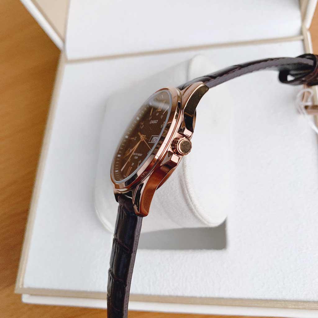Với mặt đồng hồ tròn truyền thống, màu đồng của kim chỉ và vạch chỉ giờ cùng niềng sang trọng, nổi bật trên nền đen mặt số, dây đeo da nâu thanh lịch, lịch lãm.