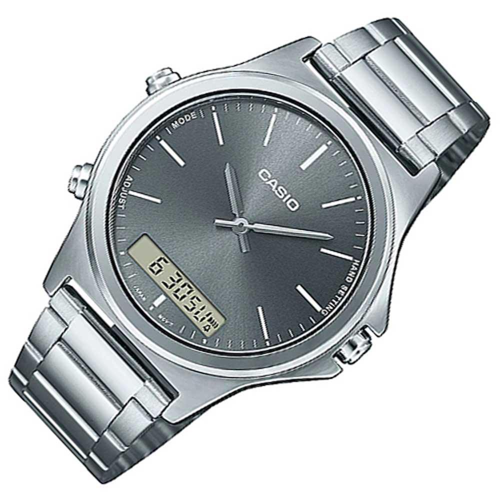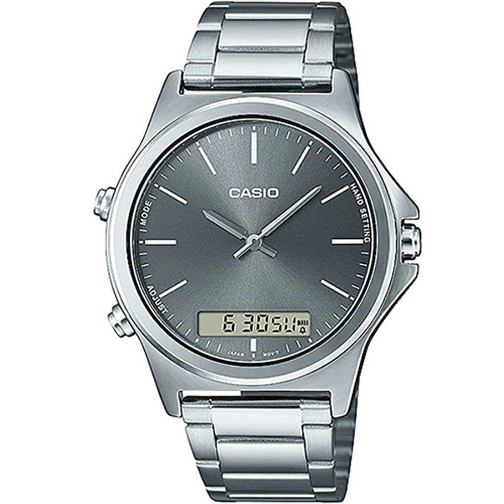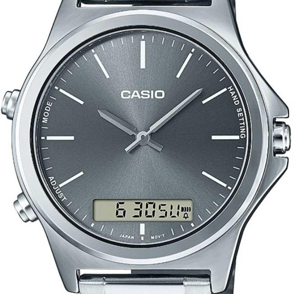 Mẫu Casio MTP-VC01D-8EUDF phiên bản kết hợp giữa chức năng kim chỉ cùng với ô số điện tử tạo nên vẻ thời trang độc đáo trên nền mặt số size 41mm với thiết kế họa tiết trải tia nhẹ.