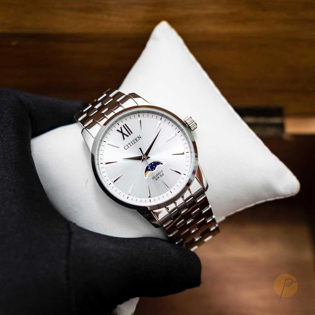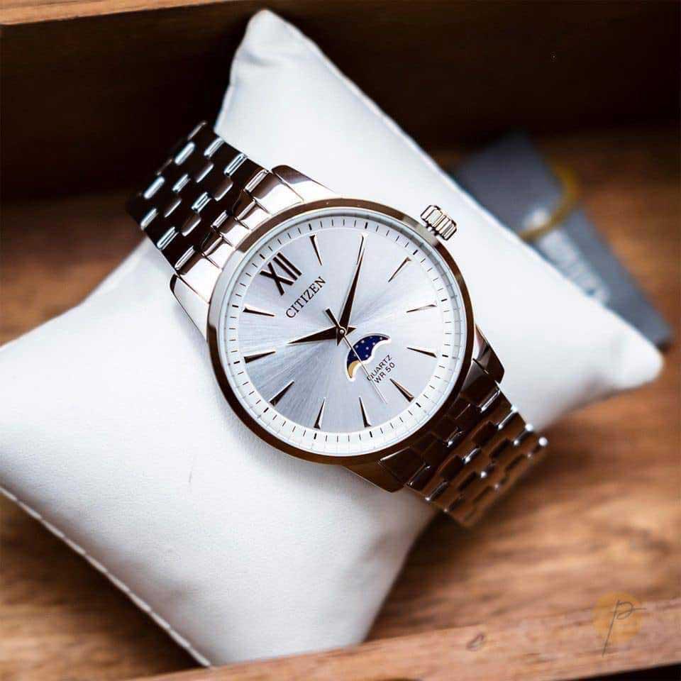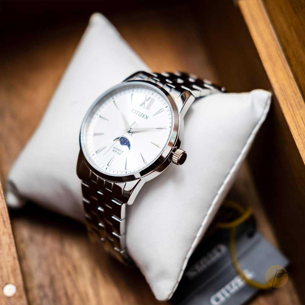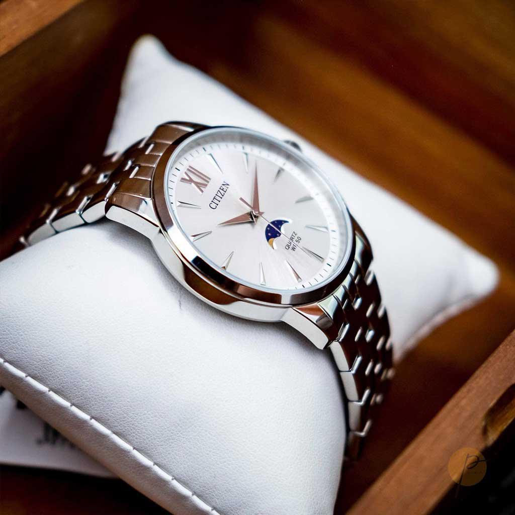 Citizen AK5000-54A moonphase tuyệt đẹp 2020 Siêu phẩm giá vô cùng tốt - Máy quartz Japan6324 bền bỉ - Size 41.5mm - Kính cứng, mặt số trắng chải tia hút mắt với thiết kế lịch mặt trăng góc 6h - Bộ kim cọc số, viền và dây thép không gỉ 316L - Chịu nước 50m