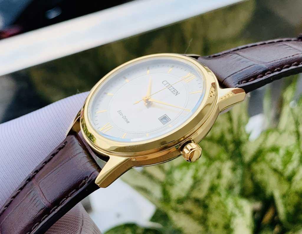 Đồng hồ Citizen AW1232-12A có vỏ kim loại mạ vàng bao quanh nền số màu trắng trang nhã, kim chỉ và vạch số dát mỏng tinh tế nổi bật, ô lịch ngày vị trí 3h, dây đeo chất liệu da nâu thanh lịch.     Khi nhắc đến thương hiệu đồng hồ Citizen, chắc chắn rằng những sản phẩm sử dụng công nghệ Eco-Drive chính là một trong những sản phẩm mà bạn không thể nào bỏ lỡ. Thật vậy, phiên bản đồng hồ Citizen AW1232-12A chính là một trong những sản phẩm có sức nóng rất cao trên thị trường hiện nay khi không chỉ nạp năng lượng bằng ánh sáng mà giá thành cũng rất hợp lý.