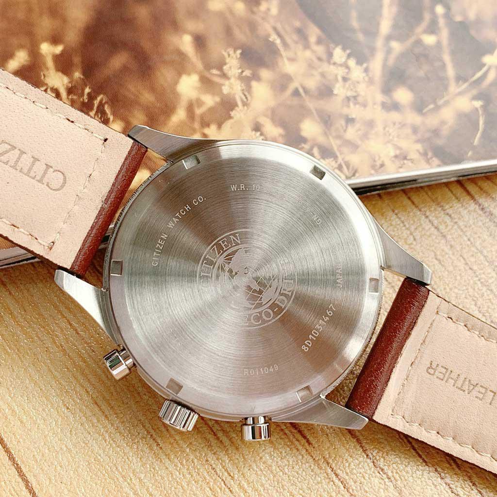 Mẫu Citizen CA7020-07A dây da trơn viền chỉ trắng tạo nên vẻ trẻ trung cho phái mạnh với thiết kế 3 núm điều chỉnh tính năng đo thời gian Chronograph hiện thị trên mặt số size 43mm