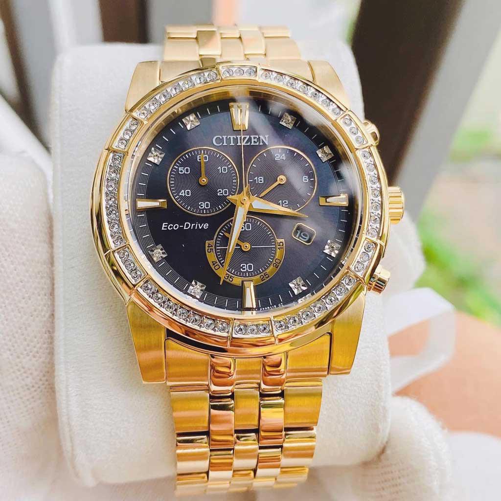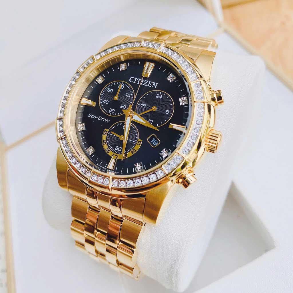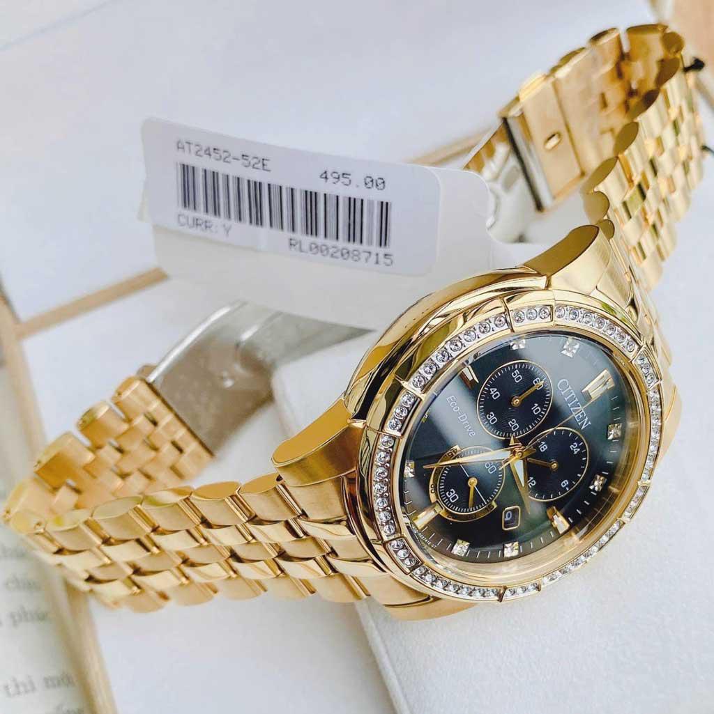 Đồng hồ nam Citizen Corso Chronograp Mặt Tròn Viền Đá Dây Kim Loại Vàng AT2452-52E máy quartz (pin), Japan (Nhật), mã máy citizen caliber eco-drive h500, mặt tròn, màu đen, mặt số kiểu chấm/trơn, có lịch ngày, kính khoáng (mineral), đường kính mặt đồng hồ 42mm, vỏ được làm bằng thép không gỉ, đáy nắp kín, chịu nước 5atm, dây kim loại, màu vàng, rộng 22mm, kiểu dáng thể thao (sport watches).