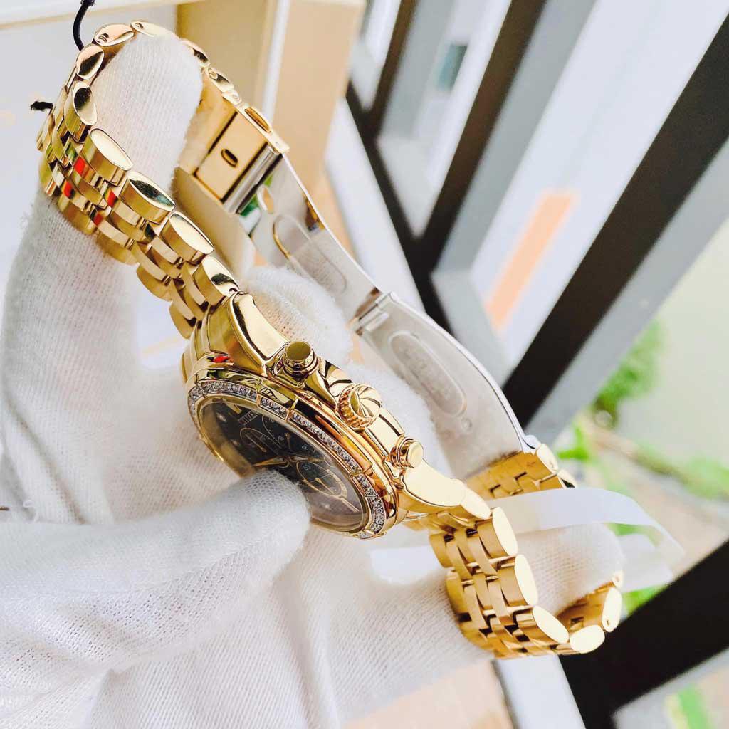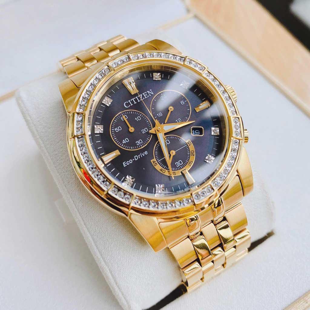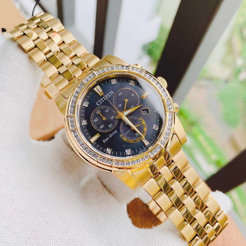 Đồng hồ nam Citizen Corso Chronograp Mặt Tròn Viền Đá Dây Kim Loại Vàng AT2452-52E máy quartz (pin), Japan (Nhật), mã máy citizen caliber eco-drive h500, mặt tròn, màu đen, mặt số kiểu chấm/trơn, có lịch ngày, kính khoáng (mineral), đường kính mặt đồng hồ 42mm, vỏ được làm bằng thép không gỉ, đáy nắp kín, chịu nước 5atm, dây kim loại, màu vàng, rộng 22mm, kiểu dáng thể thao (sport watches).