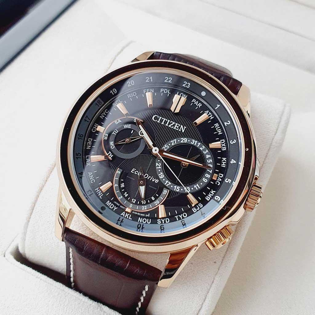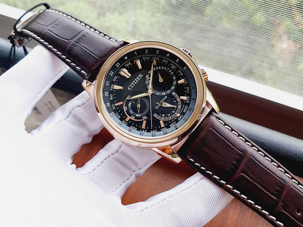 Đồng hồ Citizen BU2023-12E có vỏ kim loại bằng chất liệu thép không gỉ mạ màu đồng tinh tế quanh nền đen mặt số, mặt số hiển thị giờ thế giới một cách chi tiết, kim chỉ và vạch số được phủ phản quang nổi bật.