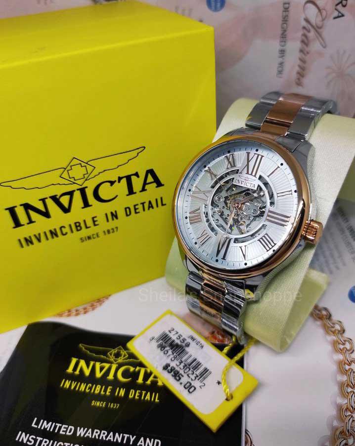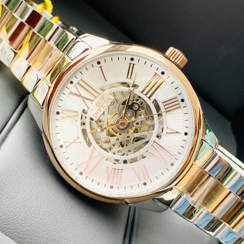 Invicta Automatic 27558 , phiên bản lộ cơ automatic cực bắt mắt. Mặt số tông màu bạc kết hợp với kim vàng hồng và vạch chỉ giờ số La Mã tạo nên sự sang trọng cổ điển.