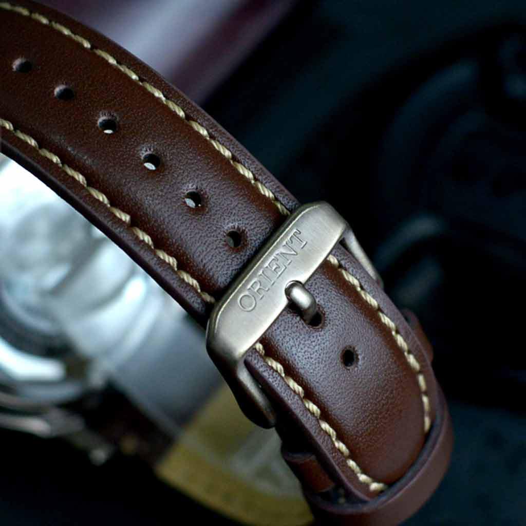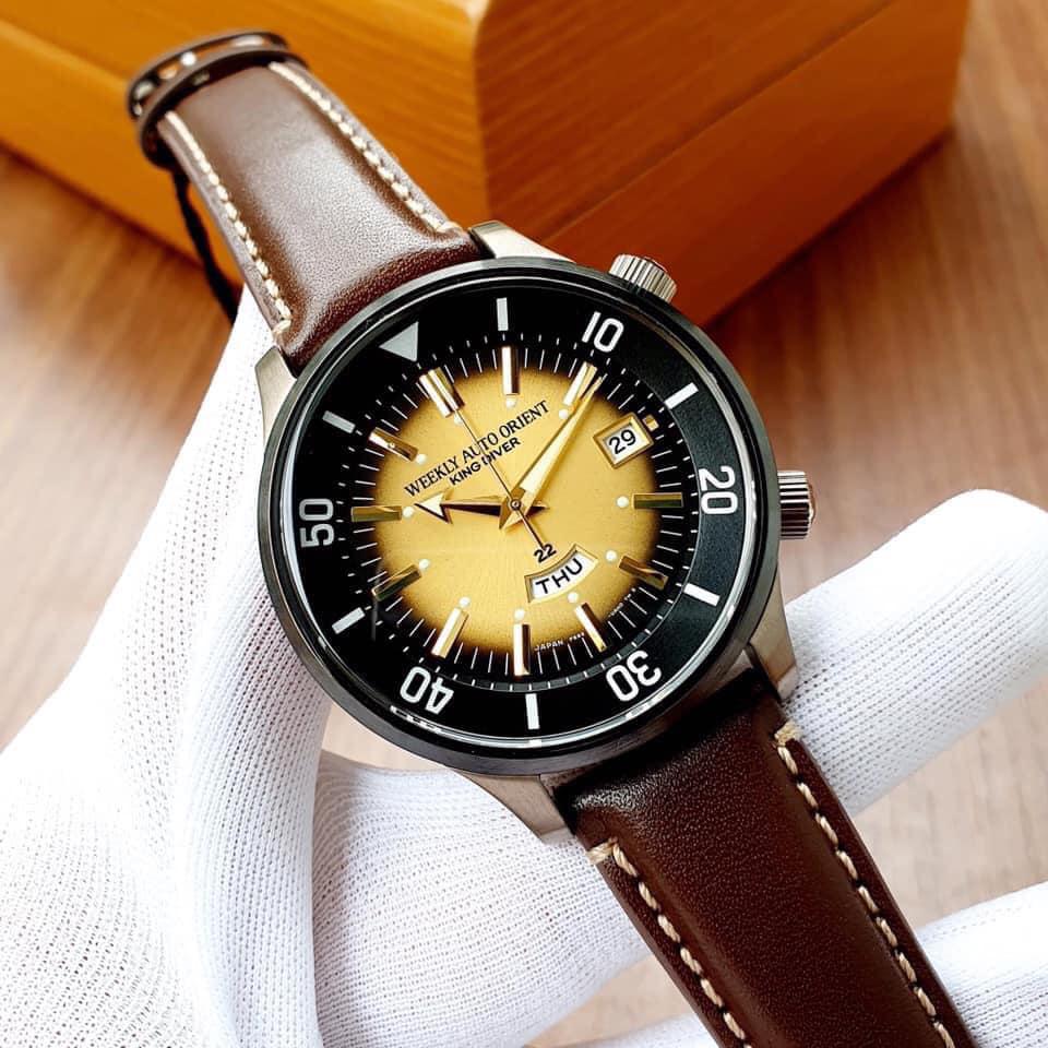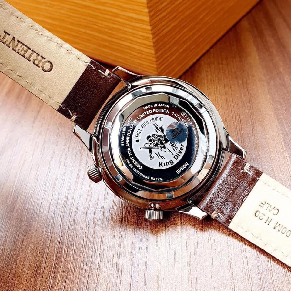 Với mặt dial, nổi bật nhất chính phần diện tích màu vàng với hiệu ứng khói mang đầy dư âm của thời gian được Orient thể hiện ở phần trung tâm mặt số. Có nhiều cách để làm cho một mẫu đồng hồ Retro tạo được cảm giác hoài cổ, xưa cũ nhưng mặt số màu khói là cách tuyệt vời nhất khi vừa đem lại cảm nhận thị giác đúng với mong muốn của nhà sản xuất và kỳ vọng của các fan hâm mộ mà vẫn thể hiện được tính hiện đại và tiến bộ trong công nghệ hoàn thiện. Ấn tương hơn đó là màu sắc ấy trở nên hài hòa với bộ vỏ thép mạ màu đồng. Điều đáng chú ý là màu sắc này không chỉ mang tính Vintage mà còn là một xu hướng nổi bật trong thiết kế đồng hồ lặn những năm gần đây với nhiều đại diện tiêu biểu đến từ các thương hiệu lớn. Ở mặt sau của đồng hồ được thể thiện theo đúng truyền thống của đồng hồ lặn. Đó là hình ảnh của một nắp lưng kín và Orient đã dành không gian này để khắc họa biểu tượng người thợ lặn với dòng chữ King Diver đầy tự hào. Phiên bản đường kính là 43,8mm, khoảng cách giữa tai càng trên dưới là 50mm, cùng độ dày 14mm, không quá lớn với mẫu đồng hồ thể thao nói chung. Mẫu đồng hồ có độ chịu nước 20ATM đủ để đi lặn nhưng tất nhiêu thông số này sẽ không áp dụng với phần dây da đi kèm. Chính vì vậy, bạn nên tránh nước để kéo dài tuổi thọ của dây.