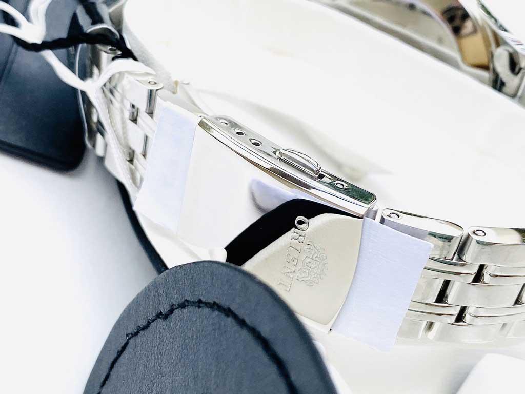 Lịch cong ở góc 12h cùng bộ kim sắc nhọn kết hợp với mặt kính sapphire tạo điểm nhấn cho mẫu đồng hồ này.