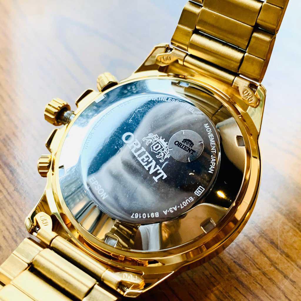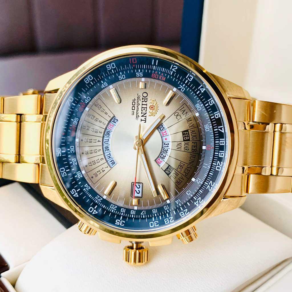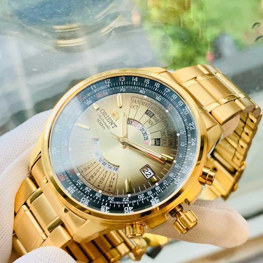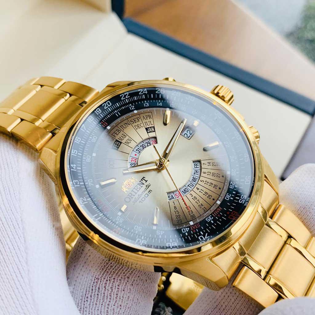 Thuộc dòng đồng hồ vạn niên của hãng. Trái ngược với các thiết kế Orient mang đậm phong cách cổ điển với thiết kế mặt số đơn giản, mẫu Orient lịch vạn niên mang cả một bộ lịch với khối lượng thông tin cực lớn vận hành trên mặt đồng hồ. Dù phải đo lường nhiều mức thời gian cùng một lúc, đồng hồ với cỗ máy In-House Nhật Bản vẫn thể hiện khả năng vận hành chính xác một cách đáng nể.    Đồng hồ Orient lịch vạn niên  ngay từ khi ra mắt đã được đón nhận nồng nhiệt. Xuất phát từ cái tên, đây là chiếc đồng hồ có chức năng lịch vạn niên độc đáo làm nên danh tiếng cho sản phẩm và đem đến luồng gió mới trong các thiết kế đồng hồ của thương hiệu Orient. Trong bài viết hôm nay, chúng ta cùng chiêm ngưỡng sức hút đến từ chiếc đồng hồ Nhật cổ điển, thanh lịch này.    Đồng hồ Orient vạn niên ấn tượng không chỉ bởi thiết kế, mà còn đặc trưng với sức hút đến từ chức năng lịch vạn niên. Cùng chiêm ngưỡng BST đồng hồ Orient vạn niên đã gây dấu ấn sâu sắc với giới mê đồng hồ trên thế giới:    ORIENT lịch vạn niên FEU07004UX v  ới thiết kế vẻ ngoài lịch lãm, sang trọng nhưng cũng không kém phần trẻ trung. Sự kết hợp hài hòa giữa các chi tiết và màu sắc tạo nên một tổng thể hoàn hảo.Size: 43mm. Mặt số được thiết ấn tượng với những vạch số tông màu vàng đồng nổi bật trên nền mặt đen.Tính năng xem thứ, ngày, tháng được thiết kế siêu ấn tượng, độc đáo. Dây da đen với những đường vân vừa mang nét cổ điển, vừa sang trọng và đẳng cấp.Chống nước 100m với núm screwdown