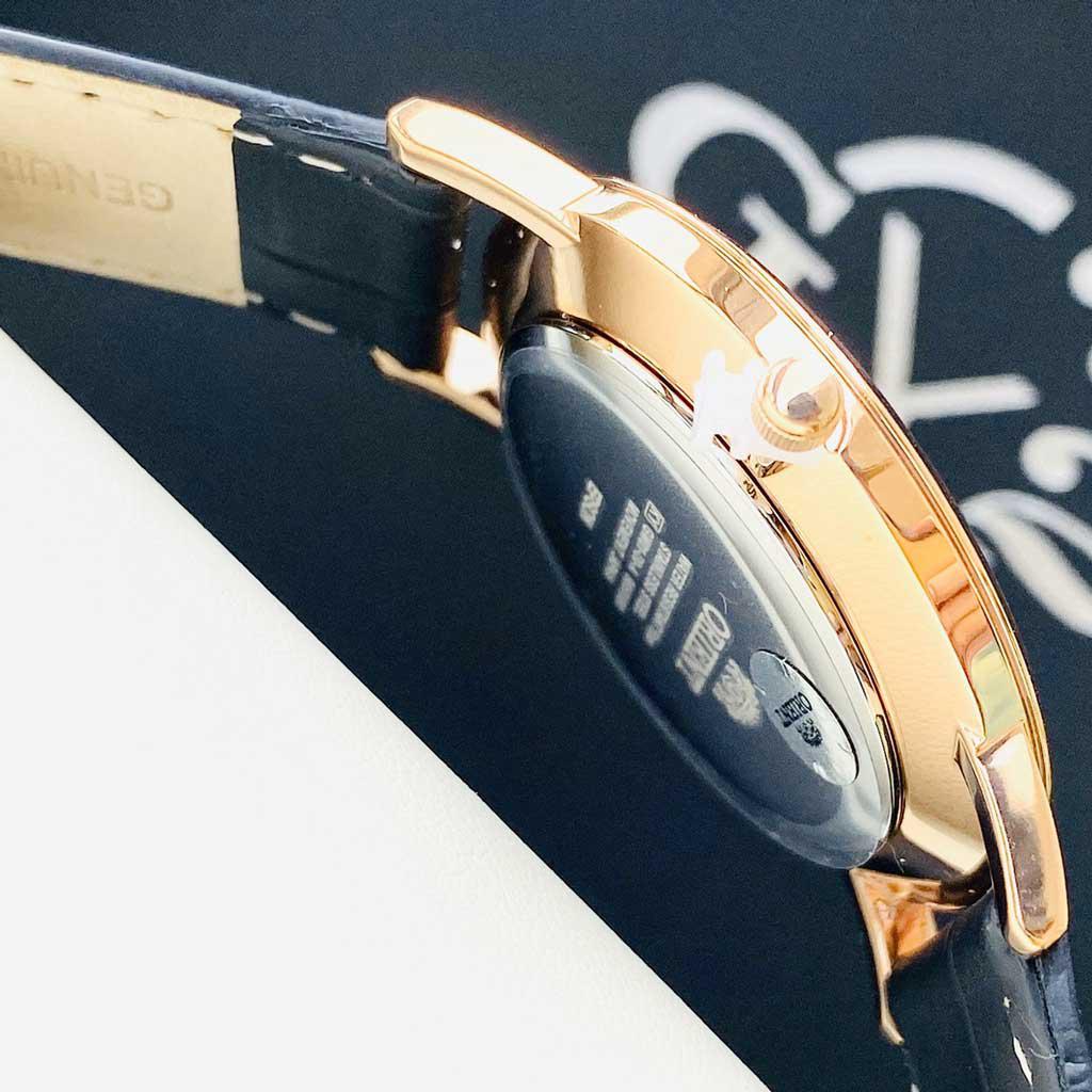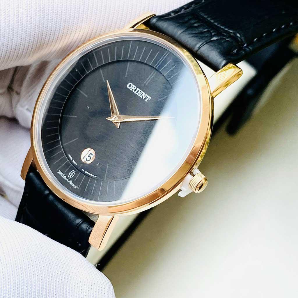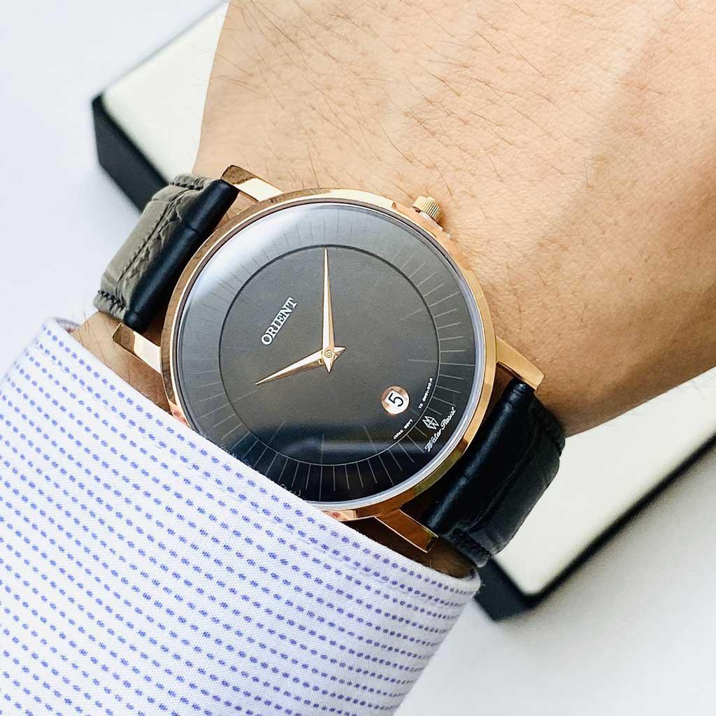 Chiếc Orient FGW0100BB0 gây ấn tượng mạnh với tông màu đen tone sur tone từ dây đeo cho đến mặt số, vỏ cùng kim đồng hồ được mạ vàng hồng đem lại một điểm nhấn vô cùng nổi bật cho tổng thế. Mặt đồng hồ với hình tròn basic, đường kính 38mm với dộ dày chỉ 7mm. Đây là một kích thước cực kỳ lý tưởng cho những chàng trai có cổ tay nhỏ và gầy hoàn toàn có thể diện mẫu đồng hồ này phù hợp. Mặt số là tông màu đen huyền bí như đã nói, nhưng điểm đặc biêt chính là từng chi tiết và bốc cục được sắp xếp. Các cọc số được tối giản hoàn toàn, thay bằng những vạch cực mảnh, khiến cho chiếc đồng hồ dường như trở nên “tàng hình” vô cùng độc đáo. Orient FGW0100BB0 chỉ với 2 kim đồng hồ mảnh nhỏ, thiết kế Dauphine đặc trưng của nhà Orient, được mạ vàng hồng vô cùng thời thượng và nổi bật. Phần núm (crown) của đồng hồ vẫn là thiết kế hình “củ hành” và được bố trí ở góc 3h thường thấy.