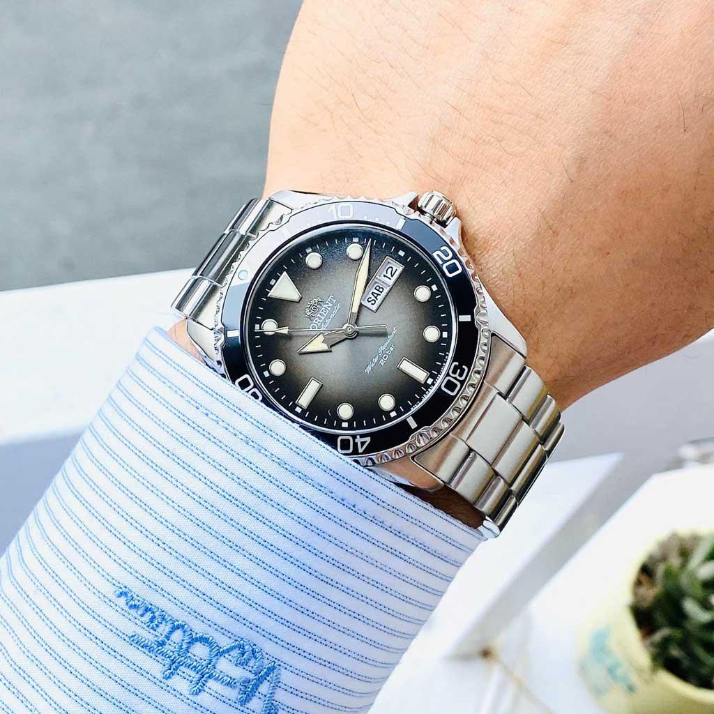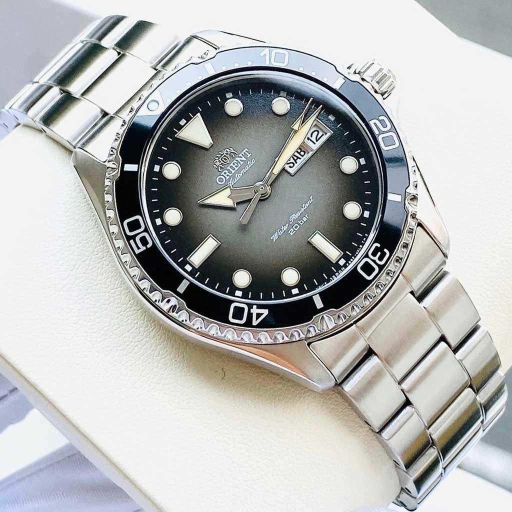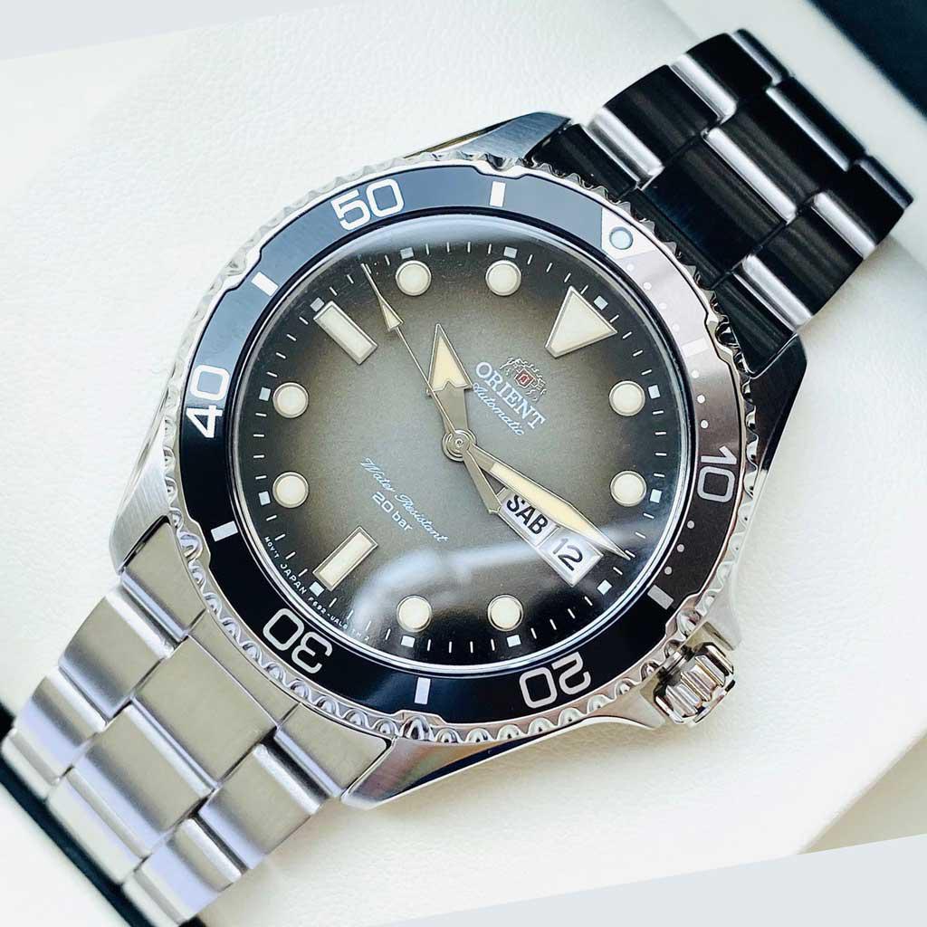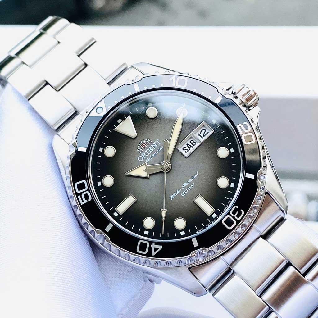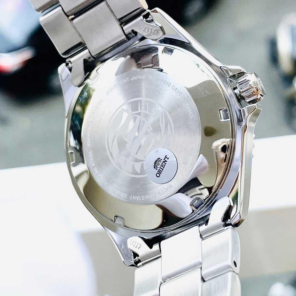 Đồng hồ lặn Orient 200 mét mới này có bộ máy tự động Orient Calibre F6922 cũng lên dây cót bằng tay và có dây. Nó có mặt số chuyển màu đen với màn hình hiển thị ngày và tháng được xem qua tinh thể sapphire chống xước. Một hướng 120 lần nhấp mượt mà giúp bạn dễ dàng tính thời gian lặn với mốc 15 phút được đánh dấu. Vỏ thép không gỉ có đường kính 41,8mm và dày 12,8mm. Lug to lug nó là 46,8mm. Các kim và vạch giờ được phủ dạ quang để đọc thời gian trong bóng tối.
