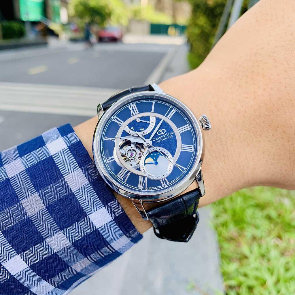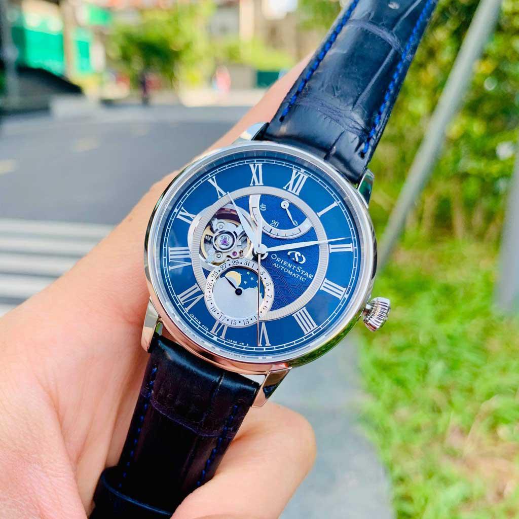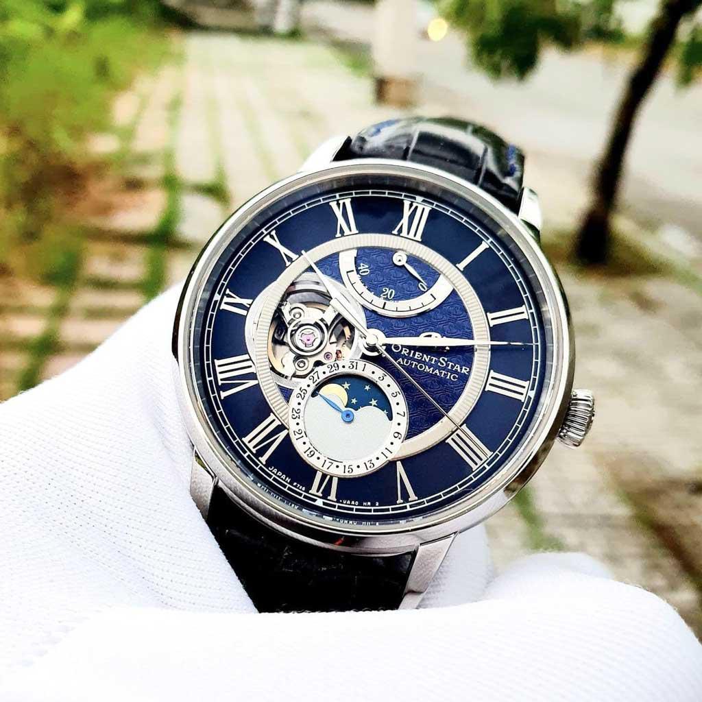 Orient Star Moon phase Blue RE-AM0002L00B Nổi bật trên mặt đhồ là ô lịch MoonPhase góc 6h rất đẹp mắt, kê bên là ô hở van tim lớn góc 9h cho phép quan sát chuyển động của cỗ máy thời gian
