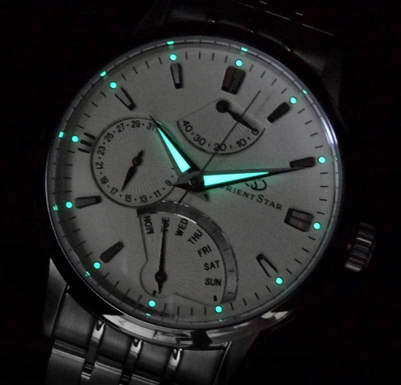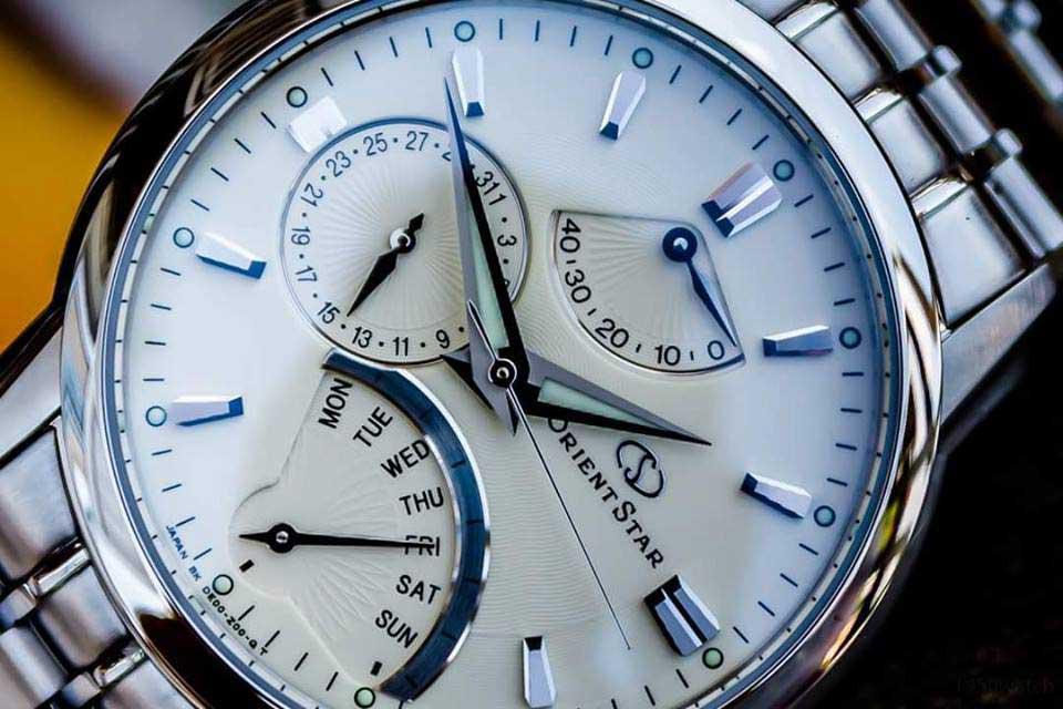 Đồng hồ Orient Star Retrograde được mệnh danh là “ngôi sao ngược”, Orient Retrograde nổi bật với lịch thứ có cơ chế lội ngược dòng. Khi kim đi hết Chủ Nhật ngay lập tức chạy ngược về vị trí Thứ Hai và hoạt động lại đúng quy trình. Vô cùng thú vị! Đi sâu vào thiết kế, Orient Retrograde chắc chắn nơi hội tụ của những bậc thầy đánh guilloche khi có tới 5 loại vân Guilloche trên mặt số – điều này góp phần thể hiện sự đầu tư trong chế tác của nhà sản xuất.
