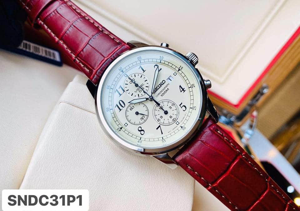 Seiko SNDC31P1 được ra đời từ ý tưởng của một chiếc đồng hồ phi công dành cho những người yêu thích phong cách thể thao hoàn hảo từ vẻ đẹp cho đến chất lượng. Chắc chắn sẽ là mảnh ghép không thể thiếu cho một suit thanh lịch và sang trọng của những quý ông. SNDC31P1 được ra đời từ ý tưởng của một chiếc đồng hồ phi công dành cho những người yêu thích phong cách thể thao, làm những công việc cần đọc thời gian nhanh và chính xác, đặc biệt là ngành hàng không, những khách hàng thường xuyên sử dụng máy bay làm công cụ di chuyển. Tổng quan chiếc đồng hồ được thiết kế theo form dáng truyền thống với mặt tròn đường kính phổ thông 40mm kết hợp dây da nâu thanh lịch. Điểm nhấn của SNDC31P1 nằm ở phần họa tiết mặt số với tông màu trắng ngà chủ đạo làm nổi bật lên các chi tiết bộ kim và cọc số. Cọc số Arab với font chữ in to, đậm cùng bộ kim vát nhọn dạ quang, giúp việc đọc thời gian trở nên dễ dàng. Ngoài ra, chức năng Chronograph hiển thị trên mặt số qua 3 ô hiển thị phụ giúp việc bấm giờ, đo lường thời gian một cách tiện lợi và chính xác nhất, thích hợp cho việc chơi thể thao hay những công việc cần phải bao quát thời gian.