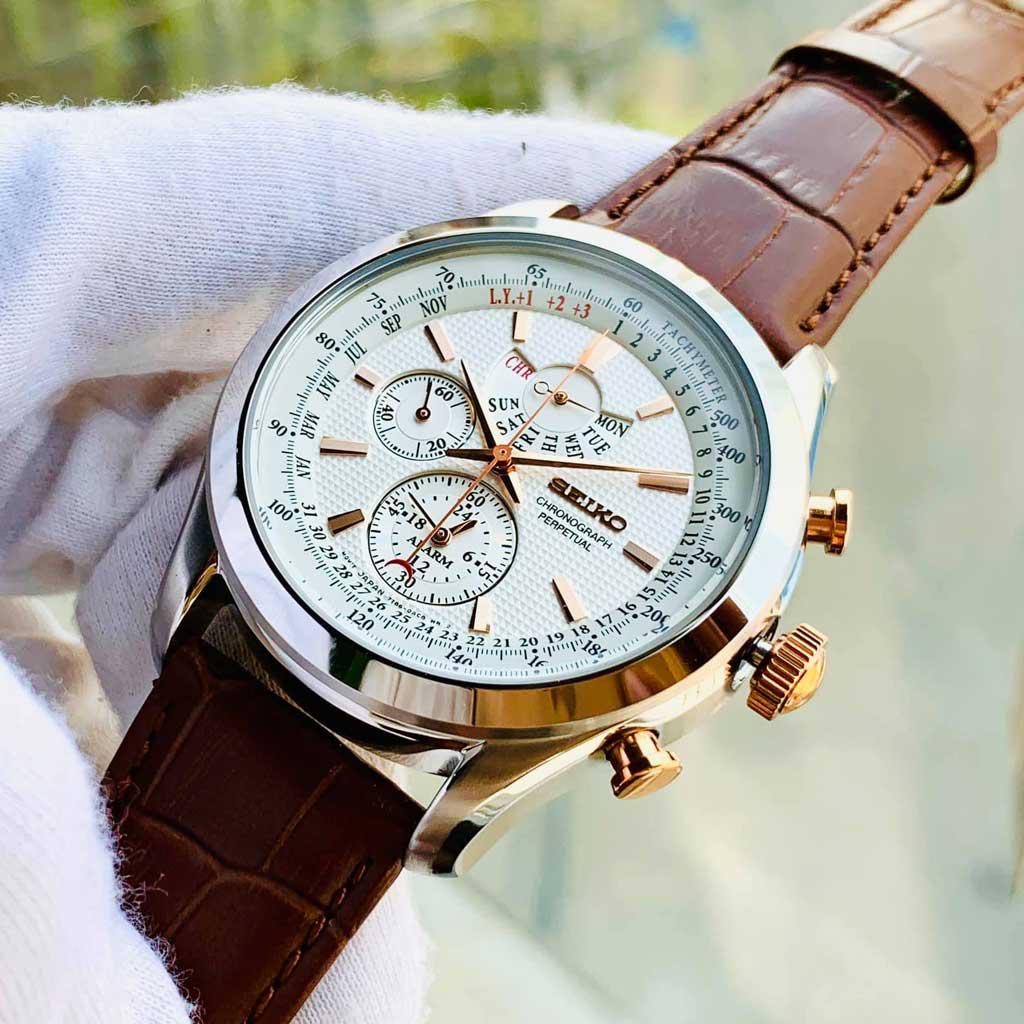 - Đồng hồ nam Seiko SPC129P1 khiến nhiều người yêu thích ngay từ cái nhìn đầu tiên với thiết kế cực ấn tượng, tinh xảo với nhiều chức năng hội tụ chỉ trong một sản phẩm. Mặt đồng hồ màu trắng, vạch số mạ vàng và có nhiều chi tiết, tính năng Chronograph, 7 kim chỉ cực rõ ràng, sắc nét. Thêm vào đó, Seiko SPC129P1 cũng có chức năng Tachymeter (đo vận tốc) chính xác. Đây sẽ là sự lựa chọn hoàn hảo cho những anh chàng cá tính, mạnh mẽ, yêu thích thể thao.