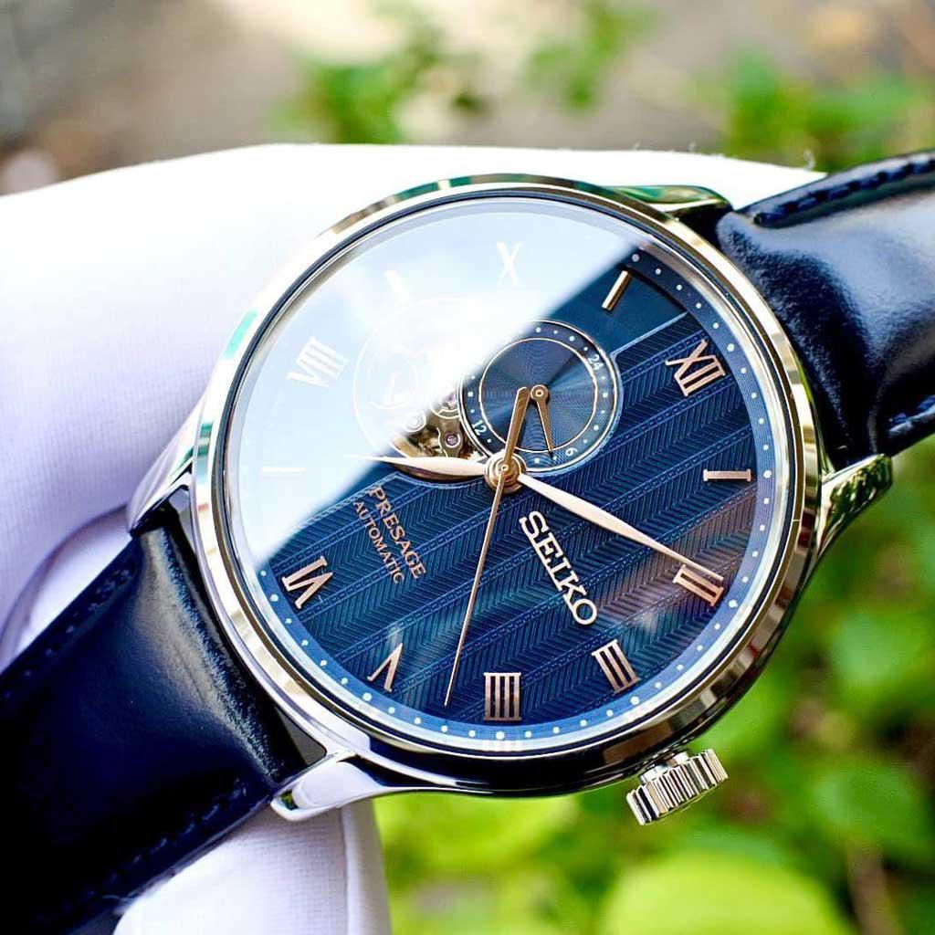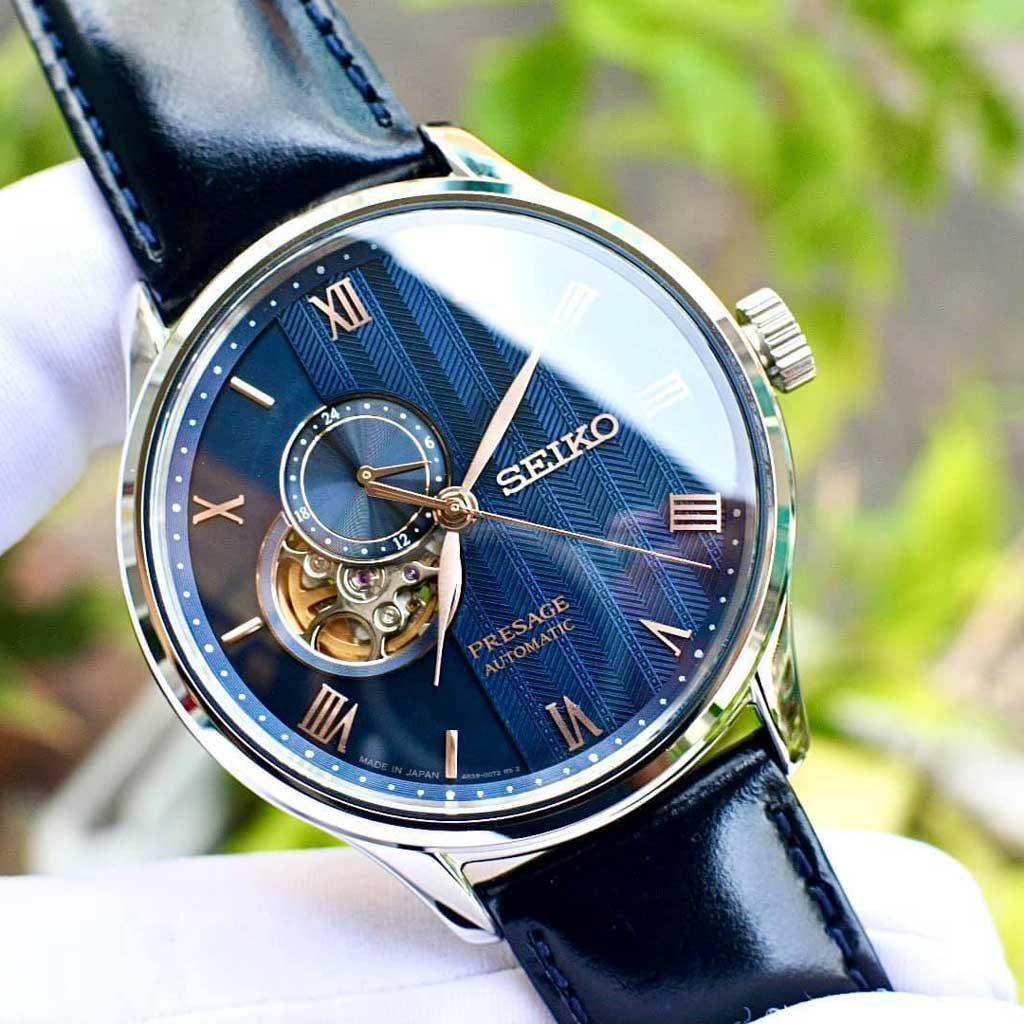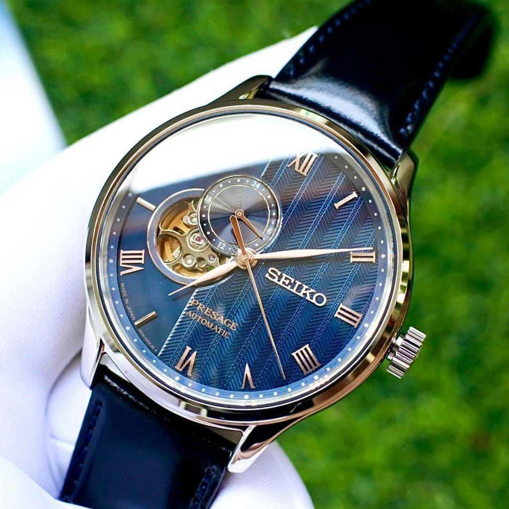 Mẫu Seiko SSA421J1 phiên bản máy cơ lộ tim với thiết kế độc đáo trên nền mặt số xanh size 38mm cùng với họa tiết Guilloche thời trang. Phiên bản mới ra mắt với Dial xanh dương, được phối bộ dây da xanh đậm cùng tone ấn tượng, ô hở tim quyến rũ, điểm nhấn nổi bật là bộ kim và cọc số mạ rose gold!