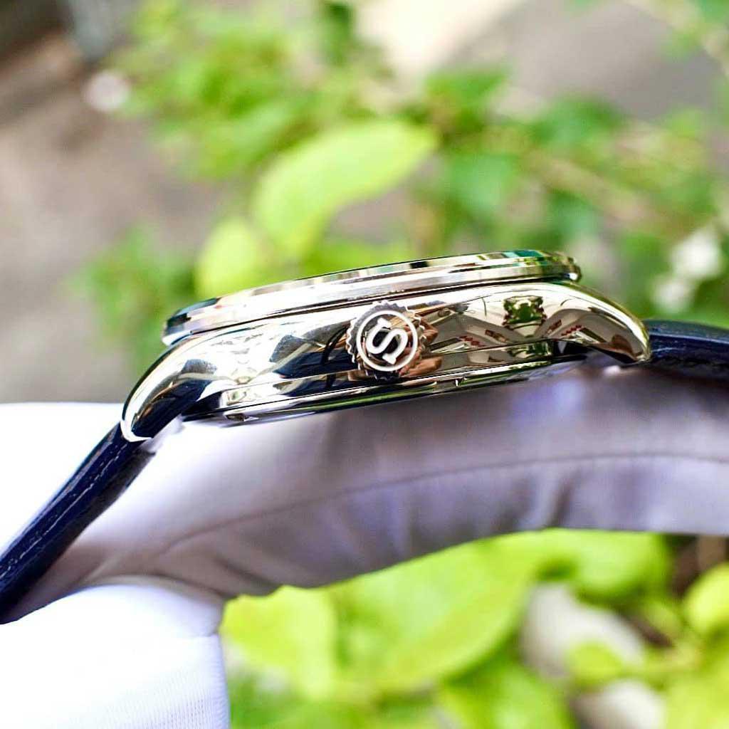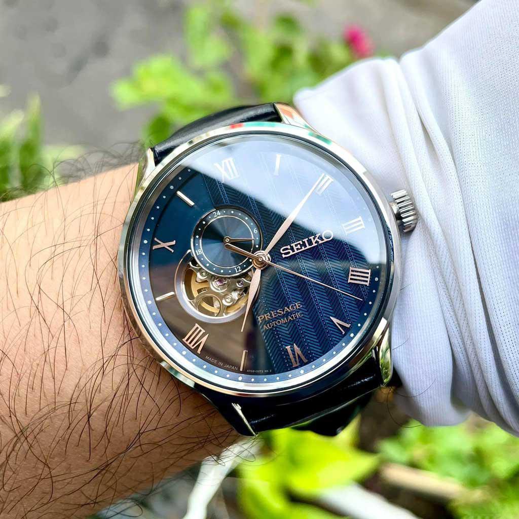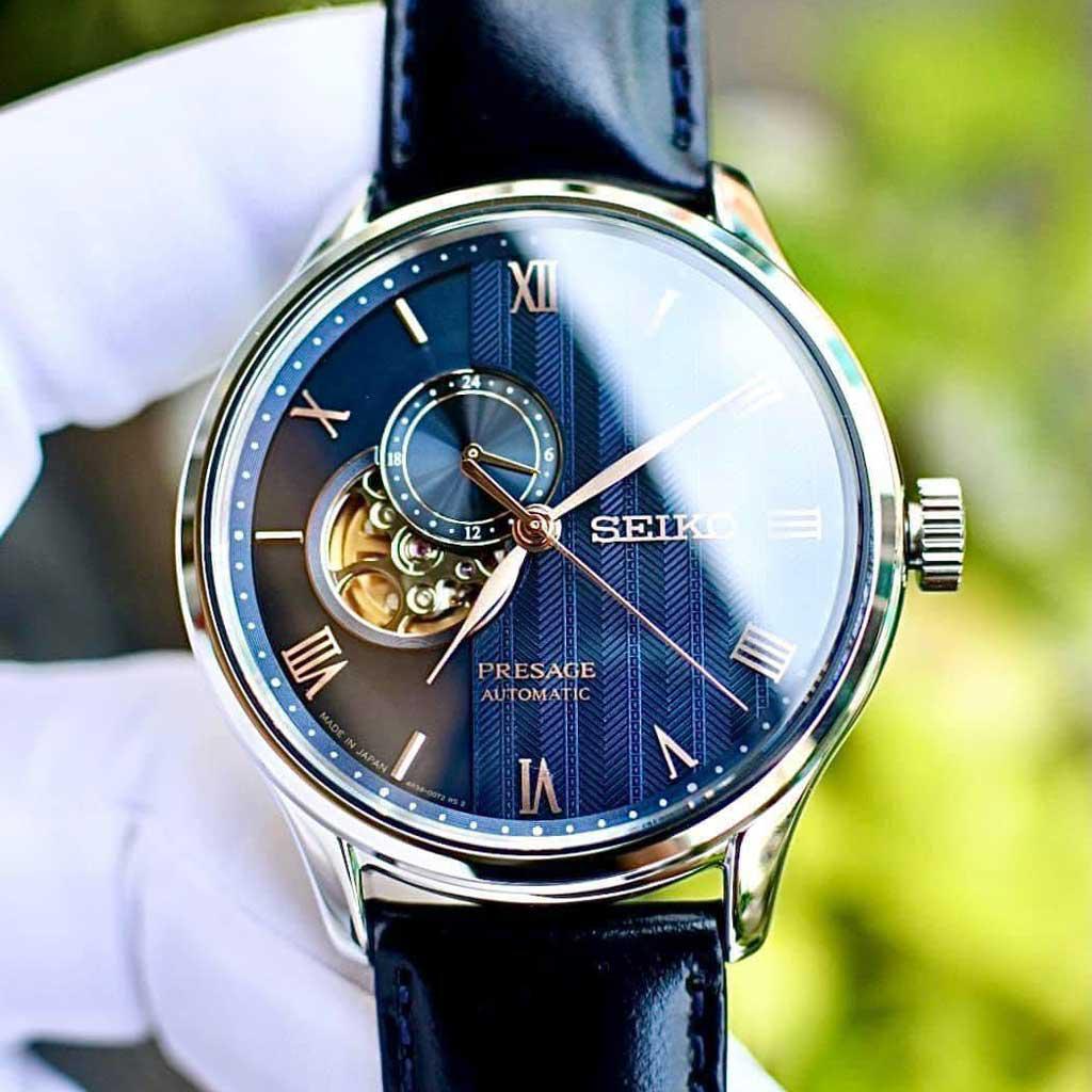Mẫu Seiko SSA421J1 phiên bản máy cơ lộ tim với thiết kế độc đáo trên nền mặt số xanh size 38mm cùng với họa tiết Guilloche thời trang. Phiên bản mới ra mắt với Dial xanh dương, được phối bộ dây da xanh đậm cùng tone ấn tượng, ô hở tim quyến rũ, điểm nhấn nổi bật là bộ kim và cọc số mạ rose gold!