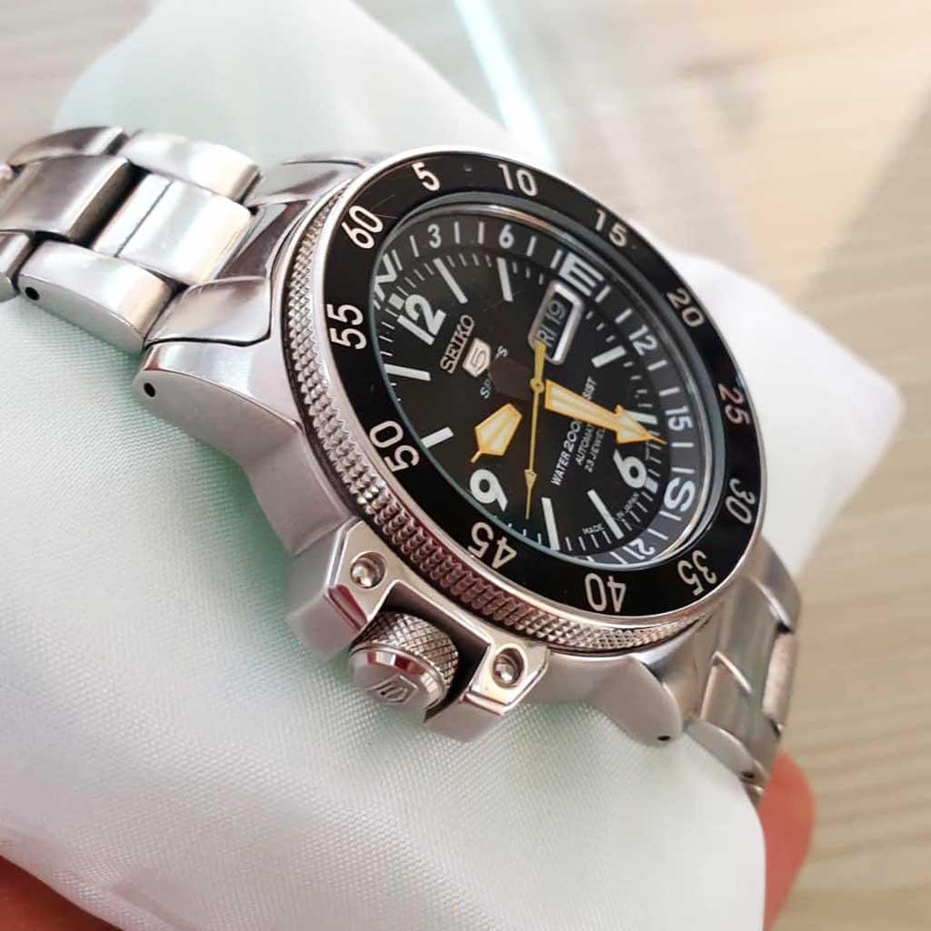 Mẫu Sport Seiko5 Automatic SKZ211J1. Kim trắng dạ quang siêu sáng. Thiết kế dial đen nổi bật đậm chất nam tính. Vòng bezel xoay. Màu đen nổi bật với các chỉ số thời gian. Núm chỉnh đươc sét góc 4h và 9h phá cách ..