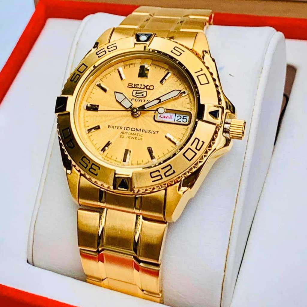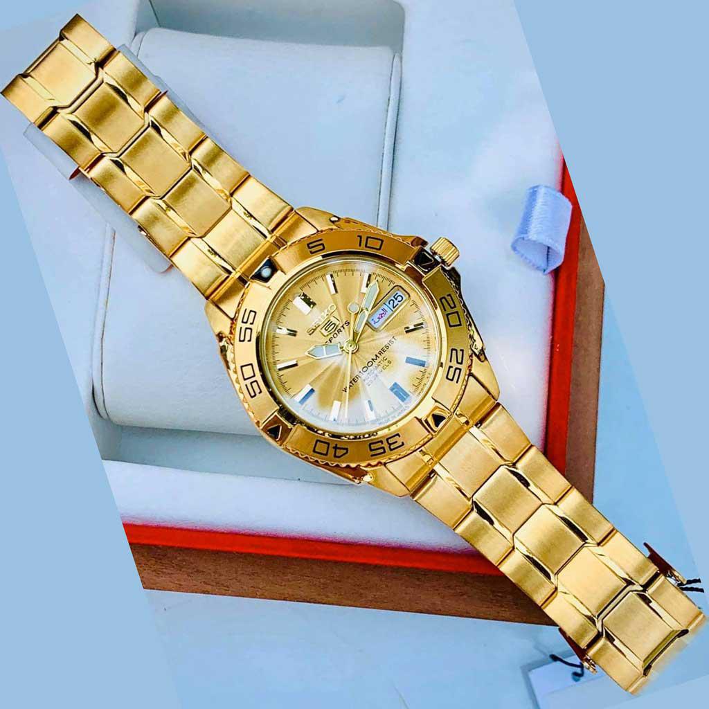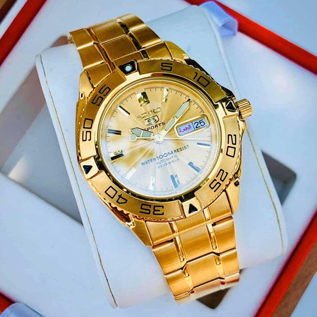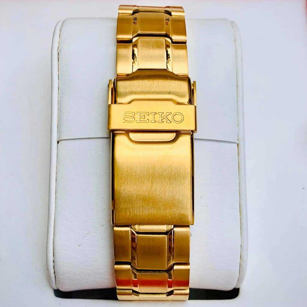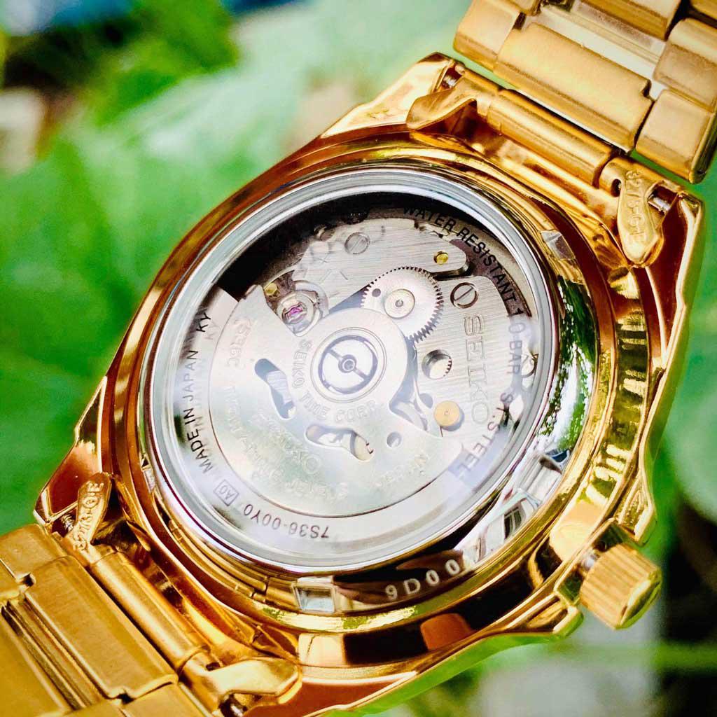 Seiko SNZB26J1 Khoác lên mình lớp mạ vàng sang trọng, độc đáo. Mặt kính cứng, viền và dây đều là thép không gỉ 316L. Cỗ máy 7S36, 23 chân kính, 21600vph, độ tích cót 38h. Ô lịch ngày, thứ đầy đủ hướng 3h, các cọc giờ và kim đều có dạ quang