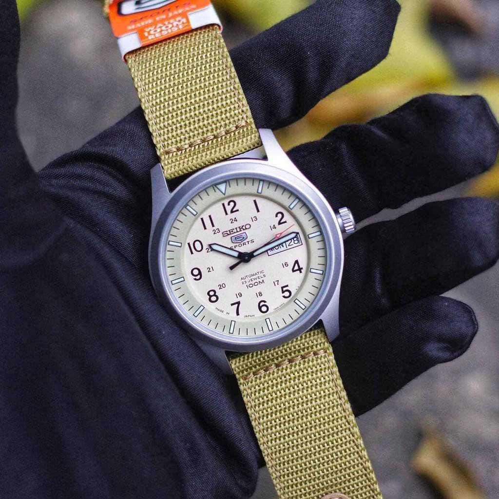 Seiko SNZG07J1 thuộc dòng sản phẩm đồng hồ Seiko 5 Quân đội. Đem lại sự bền bỉ với thời gian, thiết kế năng động trẻ trung với mọi đối tượng khách hàng. Seiko 5 Sports SNZG07J1 chính hãng cao cấp, phong cách quân đôi, chất liệu thép không gỉ, dây dù vàng cát, mặt trắng, cọc số học trò, cùng 2 lịch ngày và thứ