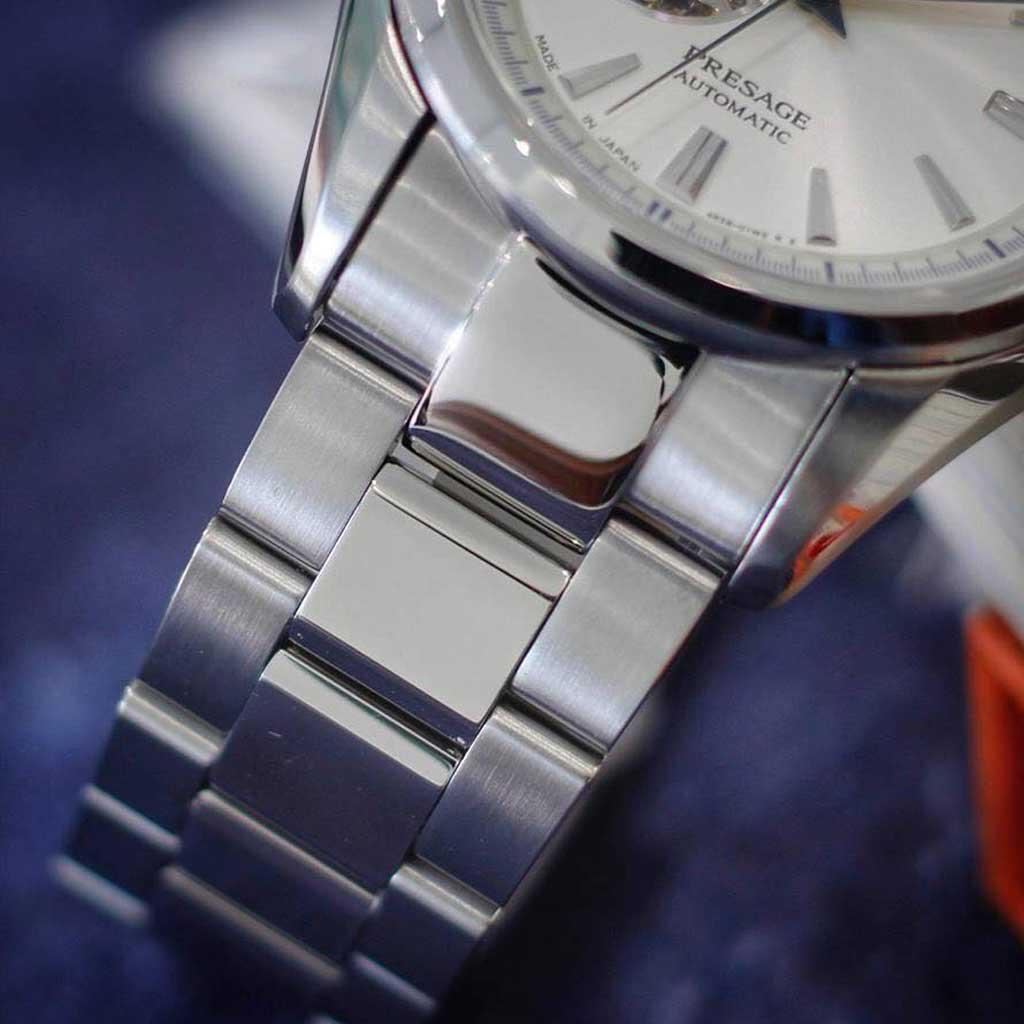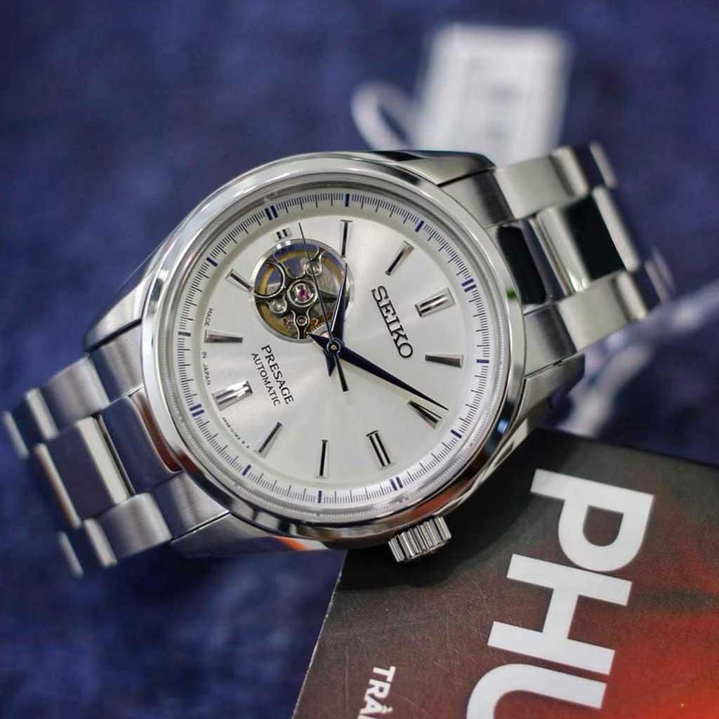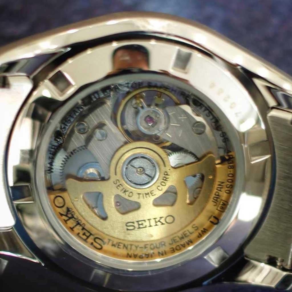 Với kích thước vỏ máy dày dặn chứa đựng một trải nghiệm bộ máy cơ đầy mạnh mẽ được phô diễn ra ngoài 1 phần của nền chân kính mặt số tạo nên vẻ độc đáo đến từ mẫu thiết kế đồng hồ nam Seiko SSA355J1