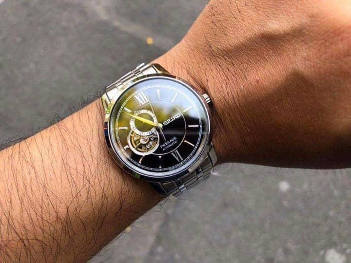 Mẫu Seiko SSA367J1 phiên bản độc đáo máy cơ lộ tim trên nền mặt số đen size 39mm, kiểu dáng đơn giản trẻ trung với chi tiết vạch số tạo hình mỏng vác cạnh.