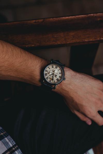 Vỏ thép không gỉ mạ ion đen với dây đeo bằng da đen (dập nổi). Gờ mạ ion màu đen cố định. Mặt đồng hồ màu xám với kim đen và vạch chỉ giờ bằng số La Mã. Điểm đánh dấu phút xung quanh vành ngoài. Loại quay số: Analog. Bốn mặt số phụ đa chức năng hiển thị: ngày, thứ trong tuần, tháng và tuần trăng. Bộ chuyển động thạch anh. Tinh thể khoáng tráng sapphire chống xước. Kéo / đẩy vương miện. Ốp lưng chắc chắn. Hình dạng hộp tròn. Kích thước vỏ: 45 mm. Độ dày vỏ: 13 mm. Chiều rộng dải: 20 mm / 22 mm. Tang kẹp. Chống nước ở 50 mét / 165 feet. Chức năng: ngày, thứ, tháng, tuần trăng, giờ, phút, giây. Phong cách đồng hồ thường. Đồng hồ nam mặt số Thomas Earnshaw Masilitiesne Grey Guiloche ES-8031-05.