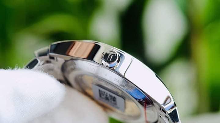 Mặt kính Tissot T038.430.11.037.00 không quá nổi bật, nó chỉ là một màu bạc đơn giản nhưng cũng chính vì điều đó mà làm chiếc đồng hồ trở nên sang trọng, sở hữu nét đẹp hiếm có. Mặt đồng hồ đi theo phong cách tối giản, các chữ số được giản lược bớt chỉ còn lại các vị trí 3, 6, 9 giờ được đánh số. Các thứ tự giờ còn lại đều là gạch thẳng đơn giản, ngoài ra vòng ngoài các gạch nhỏ hơn được đánh dấu cho số phút. Điều này góp phần tạo nên sự tiện ích cho người dùng, vì suy cho cùng thì đồng hồ vẫn phải đáp ứng nhu cầu xem giờ chính xác. Nói đến sự tiện ích sao có thể bỏ qua bộ lịch thứ ngày nhưng đối với phiên bản này thì lịch thứ, ngày được tách ra làm 2 ô chức năng riêng biệt, trên dưới, đối xứng nhau qua kim chỉ chính. Góc 12 giờ là lịch thứ, còn lại vị trí 6 giờ sở hữu bộ lịch ngày. Chúng tạo thành bộ đôi phối hợp ăn ý để giúp người dùng sắp xếp công việc hằng ngày tốt hơn. Kim chỉ là thành phần tạo nên sự khác biệt, nó được cách điệu giống như hình khối, vát nhọn ở đầu tạo nên sự tinh tế, đồng thời thể hiện thời gian chính xác hơn. Trên một mặt kính đơn giản thì đây được xem là điểm nhấn thú vị giúp chiếc đồng hồ lọt vào mắt xanh của những ai tinh tế, chịu quan sát. Đi kèm với đó, nhà thiết kế cũng cho núm vặn bên tay phải thuộc hình thù khối, đồng bộ với chi tiết bên trong mặt số. Tổng thể là sự hài hòa giữa những đặc điểm tưởng chừng nhỏ bé nhưng làm nên sự tinh tế, thể hiện sự đầu tư của nhà sản xuất cho đứa con tinh thần của mình. Và “trùm cuối” bao phủ bên ngoài đó chính là lớp kính sapphire chống trầy, chất liệu cao cấp này nổi tiếng và được nhiều người yêu thích sử dụng dù phải bỏ ra số tiền cao đi chăng nữa. Những đặc điểm như: chống trầy tốt, độ trong suốt cao, không dễ dàng hư hỏng, vỡ,…làm cho sapphire khác biệt hoàn toàn so với kính cứng thông thường.