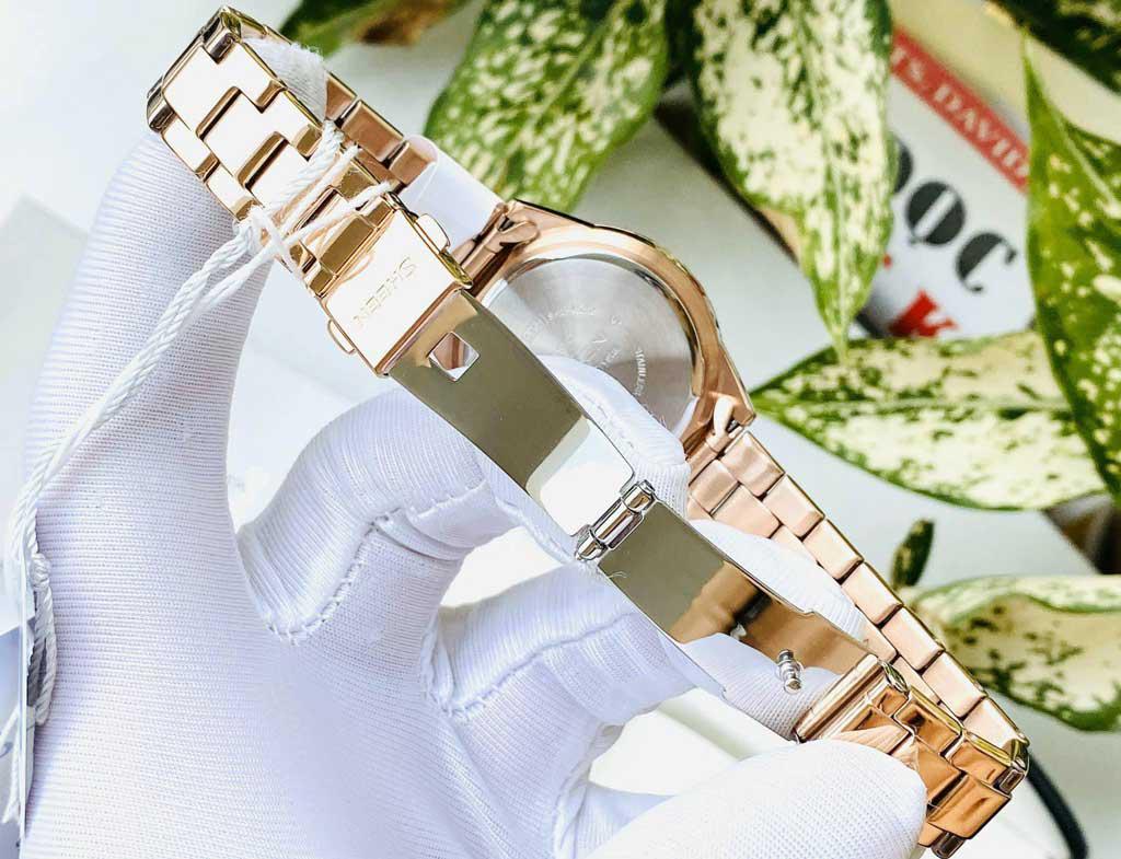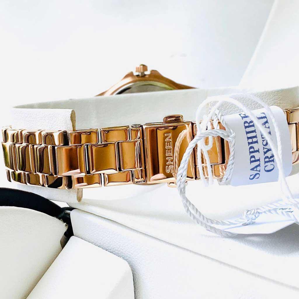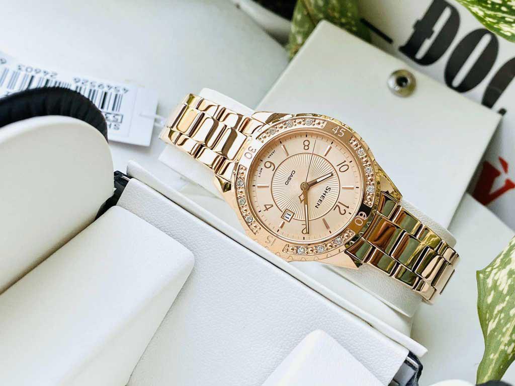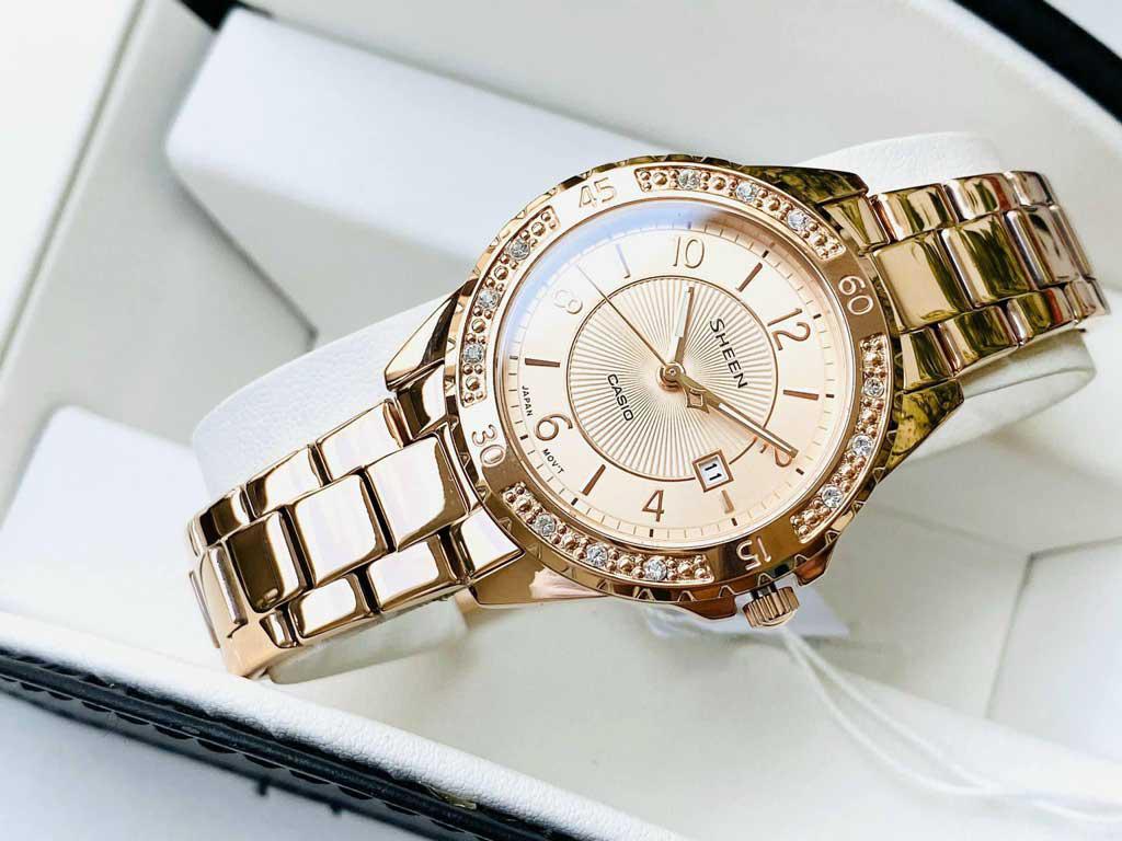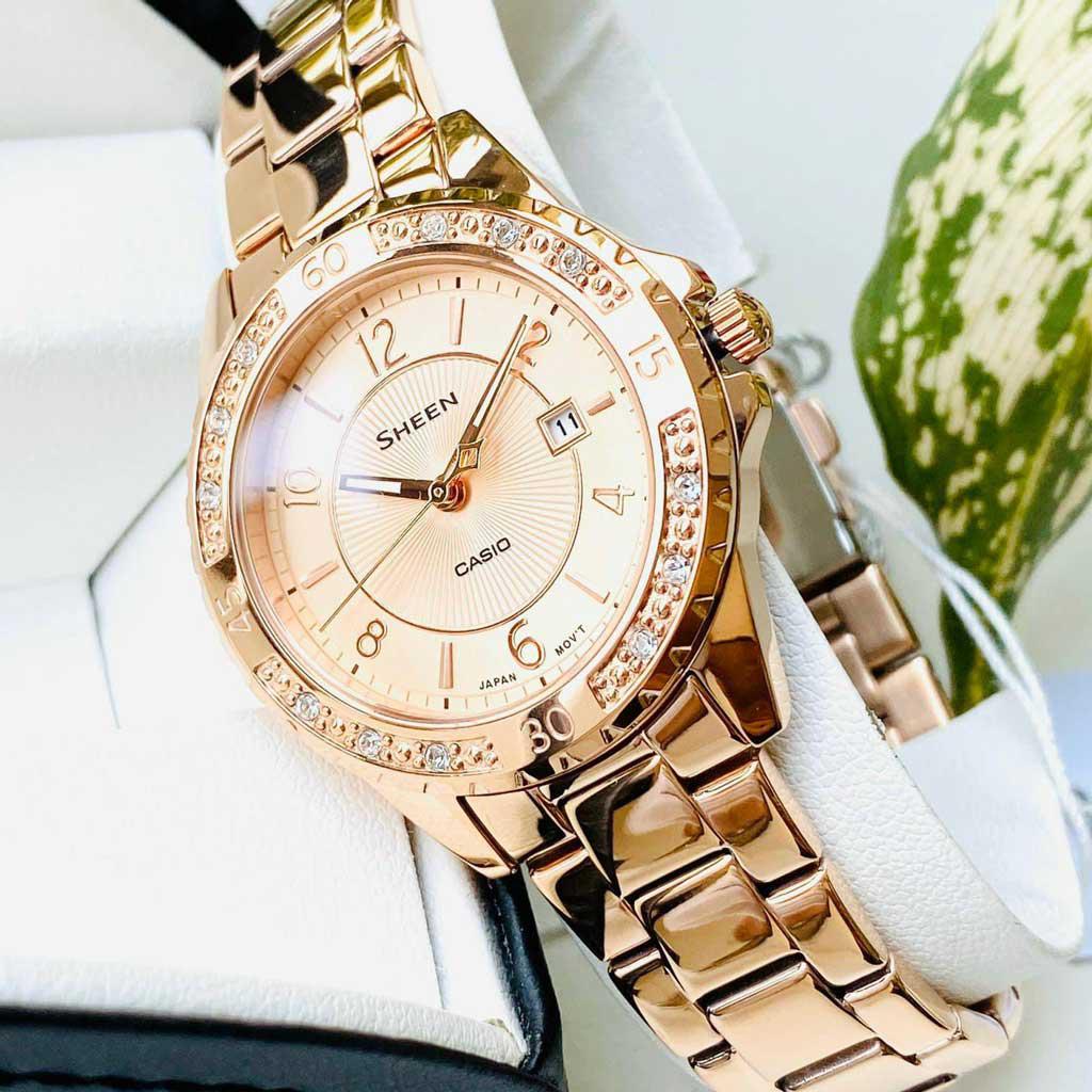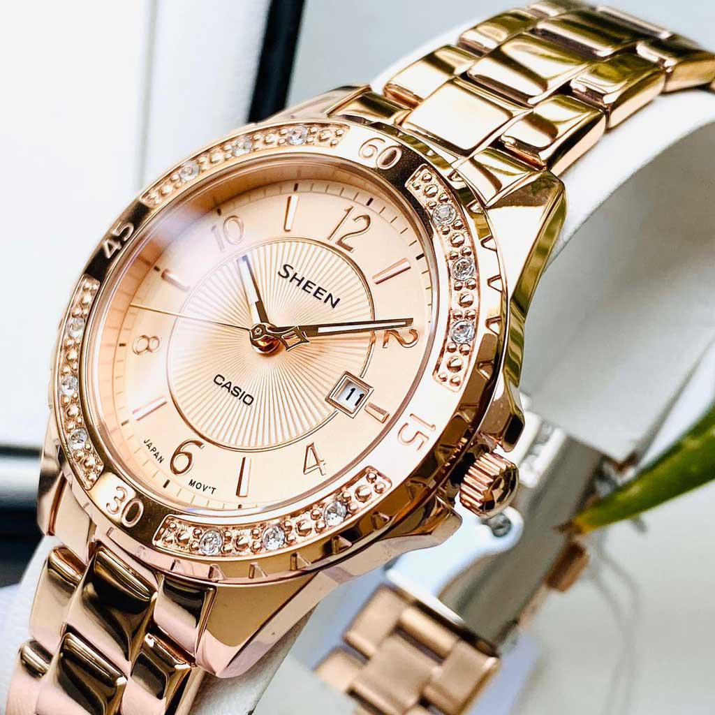 Casio SHE-4532PG-4A Nổi bật với gam màu rose vàng hồng cực sang chảnh, viền được đính đá pha lê Swarovskir siêu sáng. Phong cách thời trang sang chãnh đẳng cấp cho các chị em