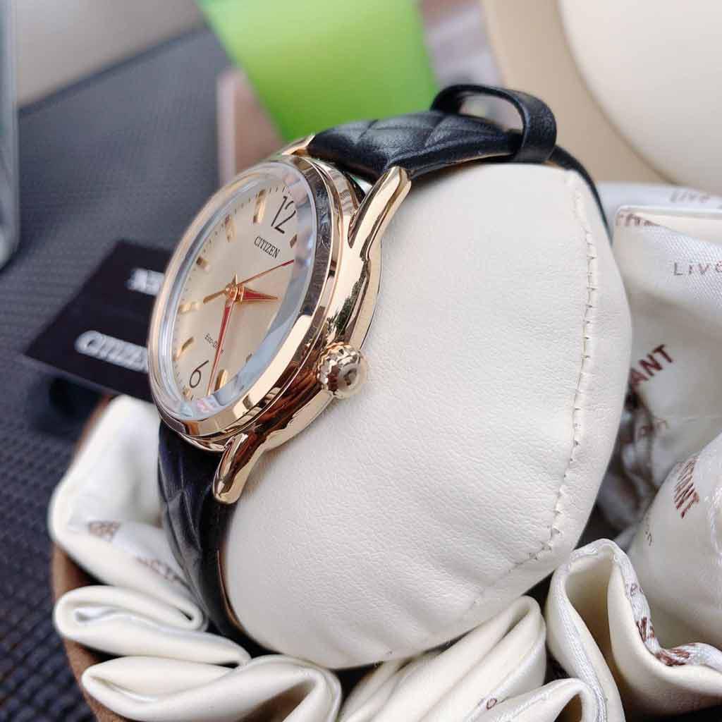 Dòng Eco-drive, máy Nhật. Viền rose gold, mặt champage dây da vân cá tính nhưng rất thanh lịch.