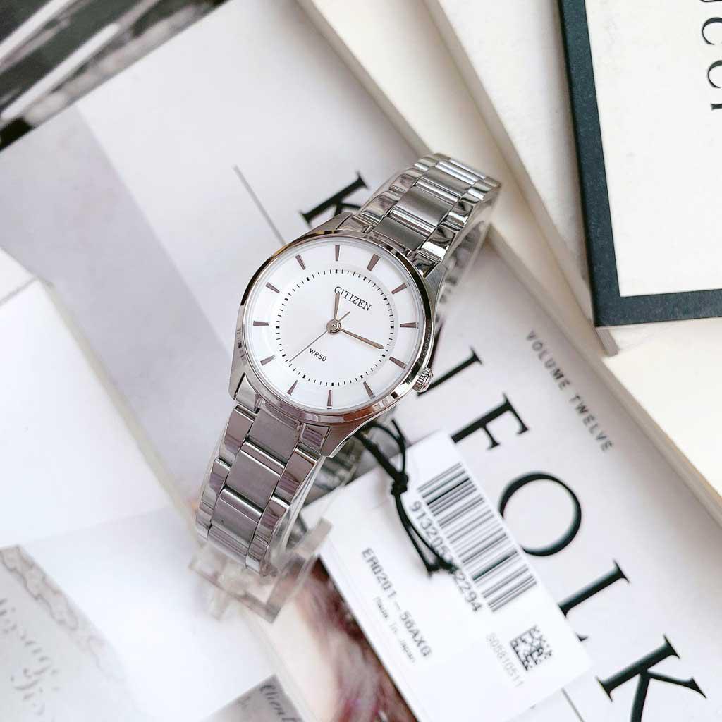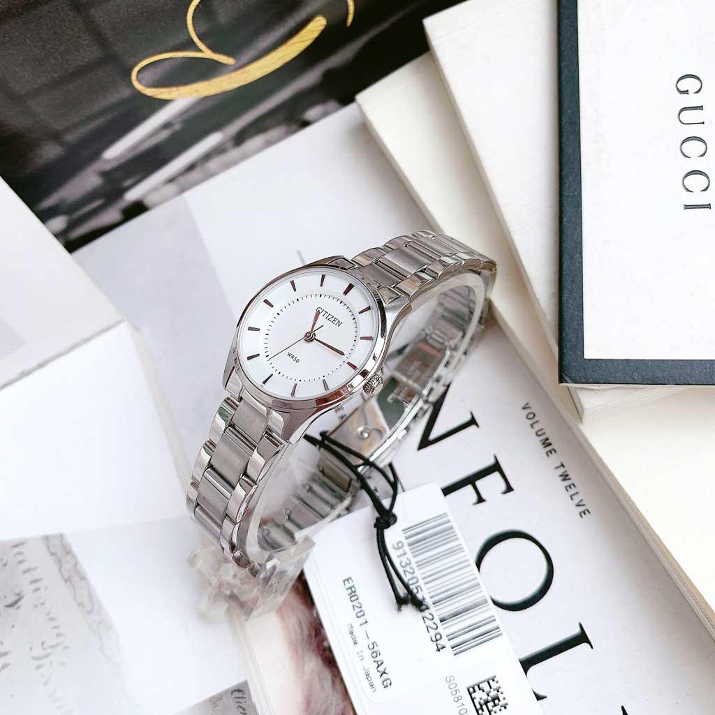 Đồng hồ là một sản phẩm phụ kiện không chỉ mang chức năng sử dụng, mà còn là món phụ kiện làm đẹp, nhất là đối với chị em phụ nữ. Bởi vậy, thương hiệu đồng hồ Citizen liên tục cho ra mắt những thiết kế đẹp mắt, thu hút. Mới đây nhất là sản phẩm đồng hồ Citizen ER0201-56A . Điểm cộng cho vẻ đẹp thanh lịch, đơn giản sẽ là nhấn nhá thu hút người dùng.