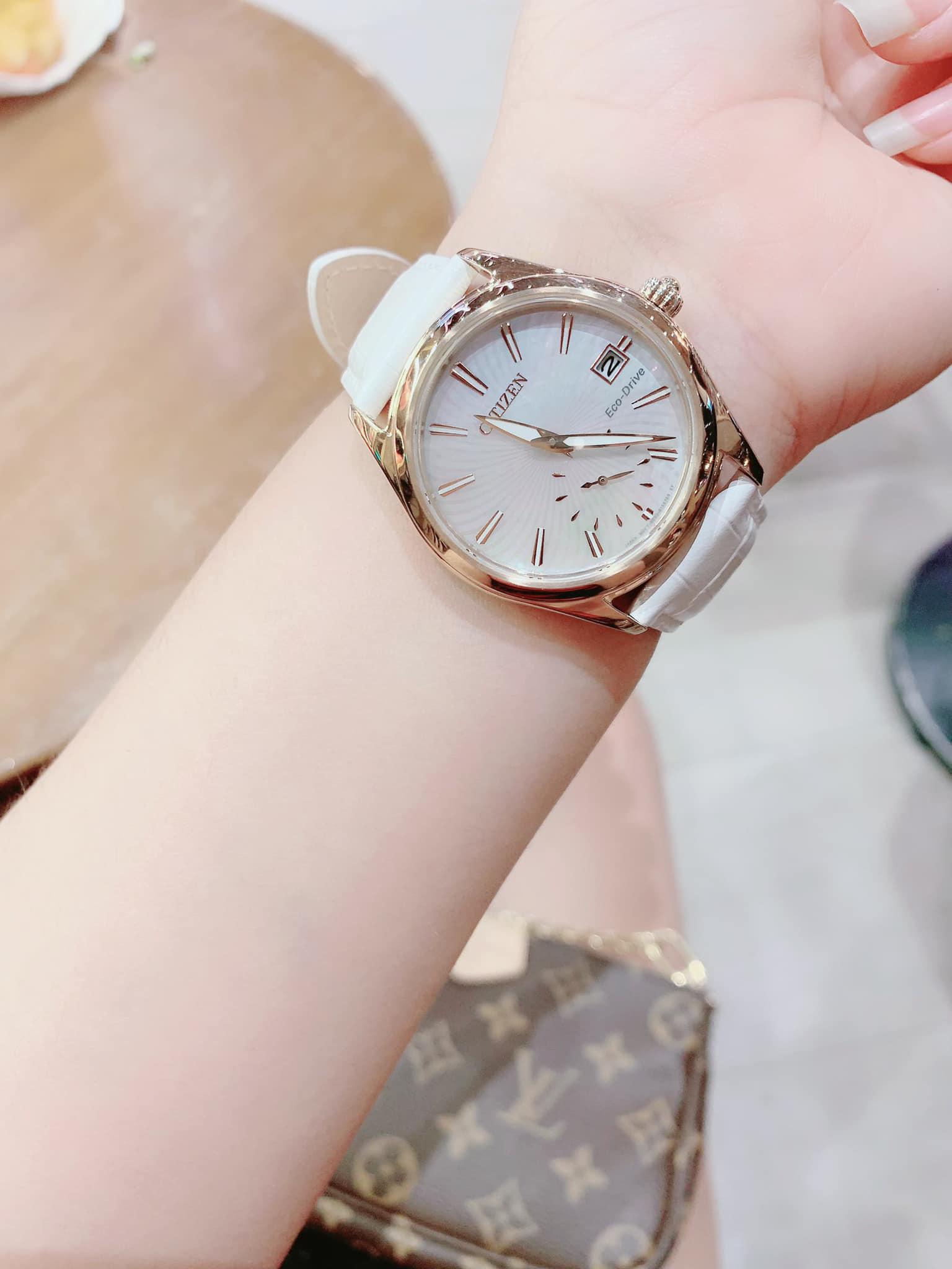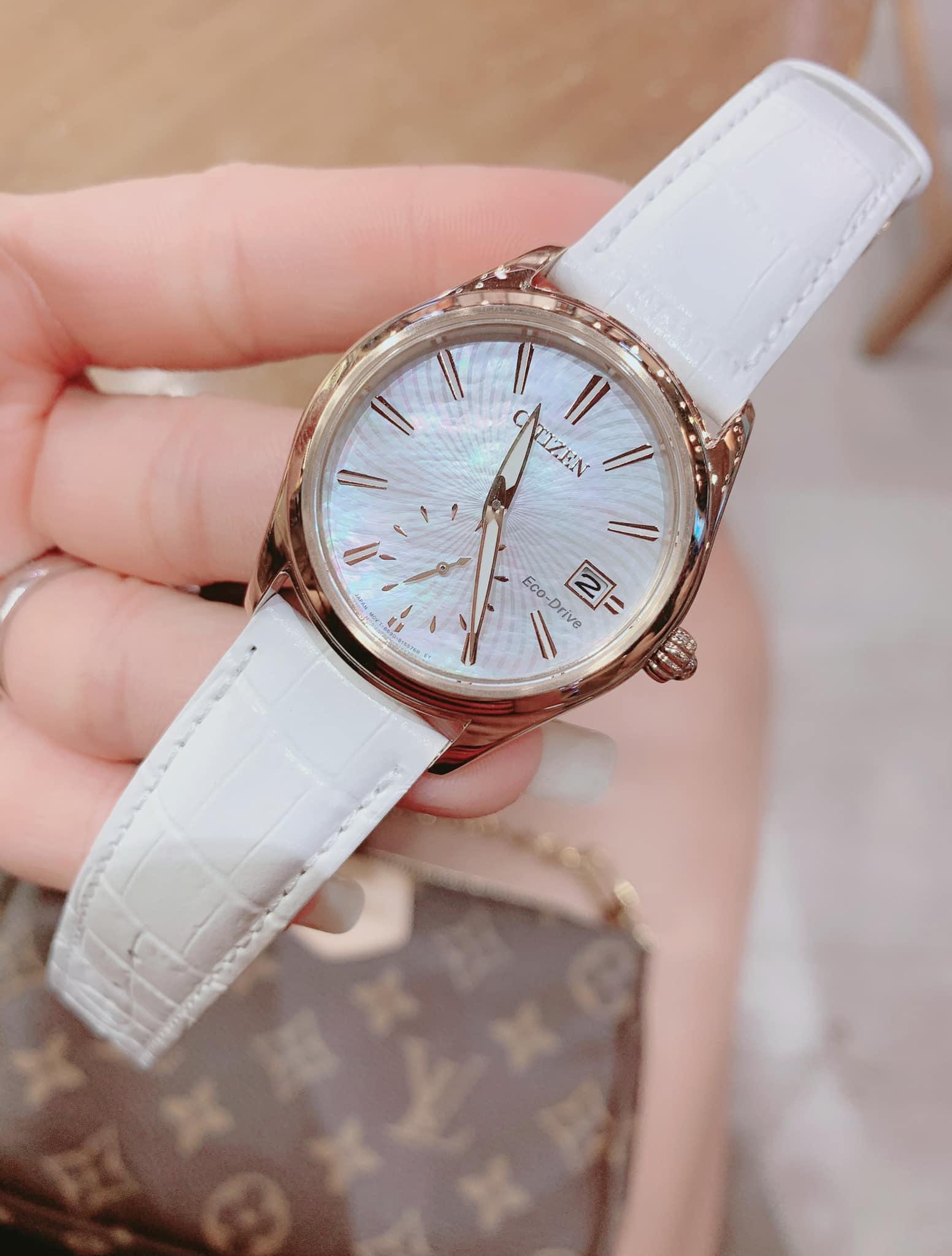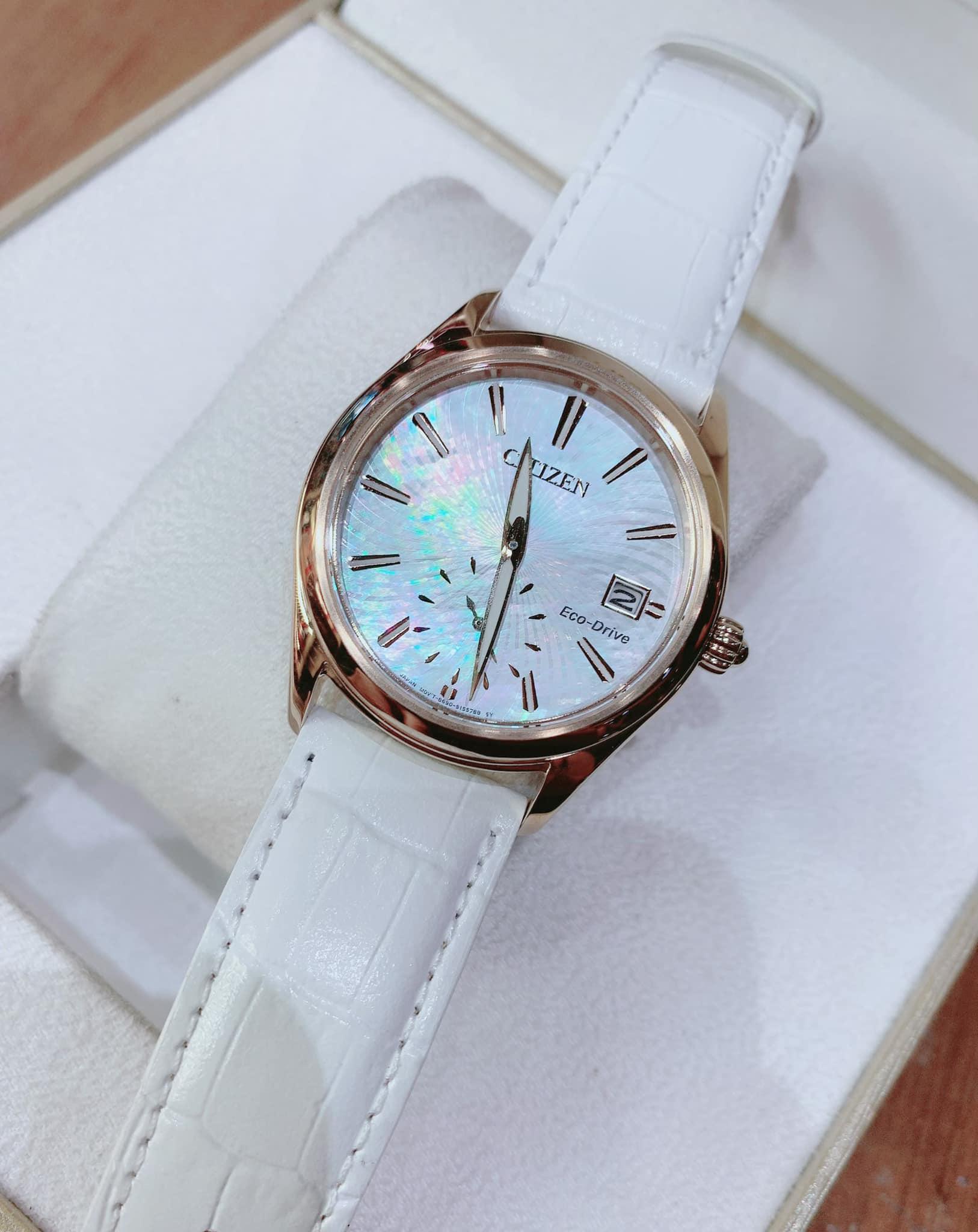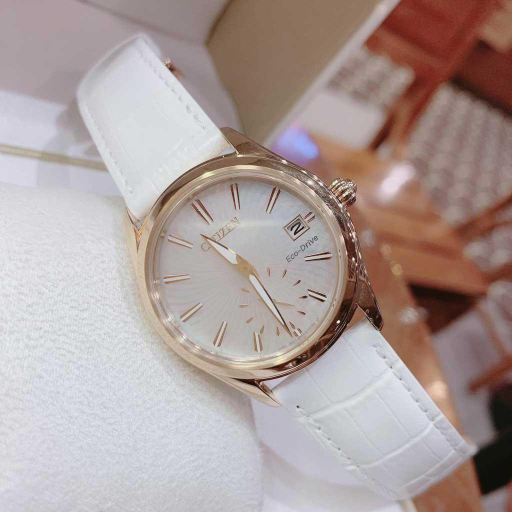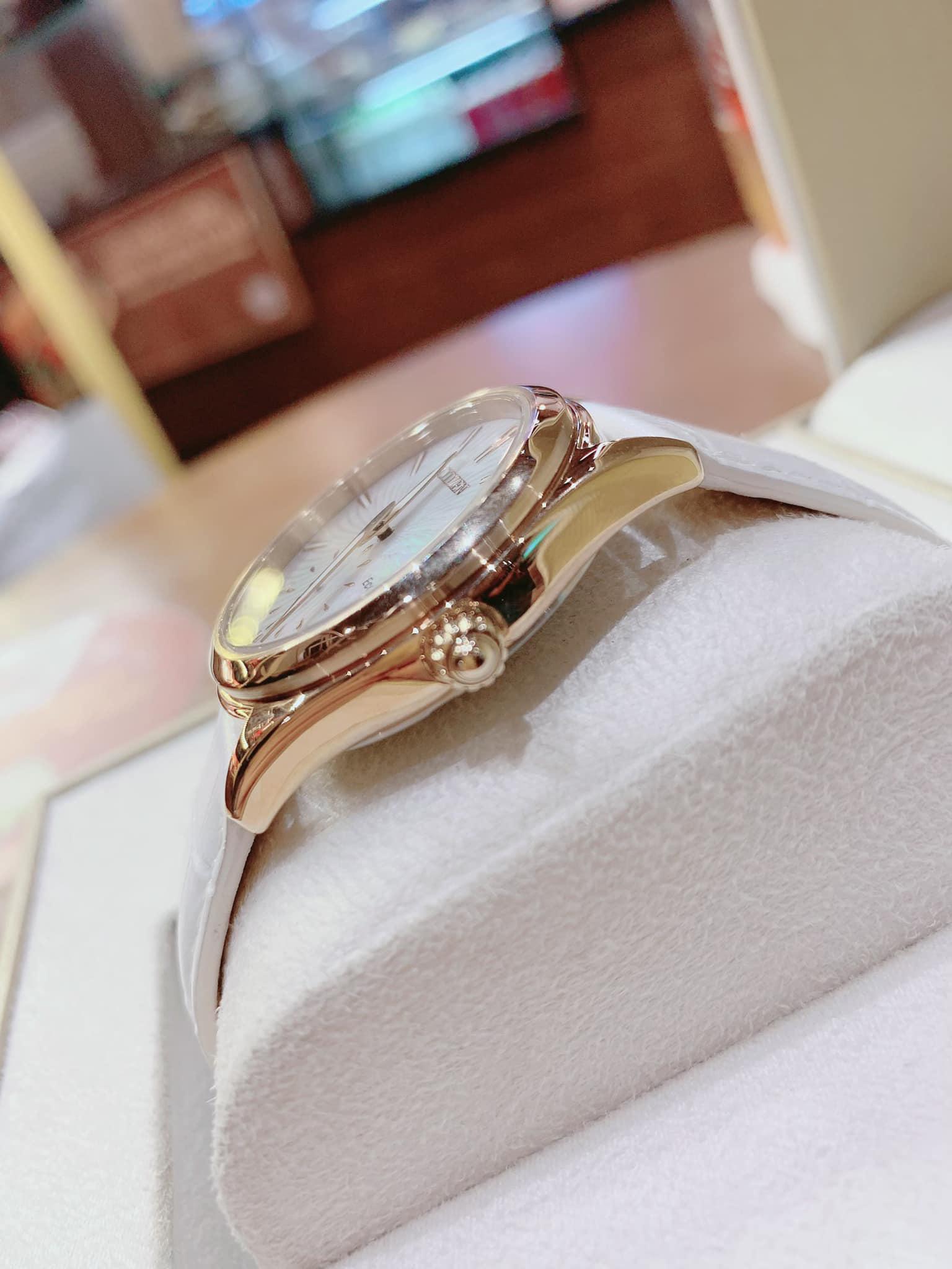 Citizen EV1033-08D Eco- Drive với công nghệ ánh sáng mặt trời của máy Nhật.Máy nhật, siêu bền. Mặt tông màu Rose Gold sáng bóng. Dây trắng trẻ trung. Mặt kính khảm xà cừ sang trọng. Mặt kính khoáng chống trầy xước.