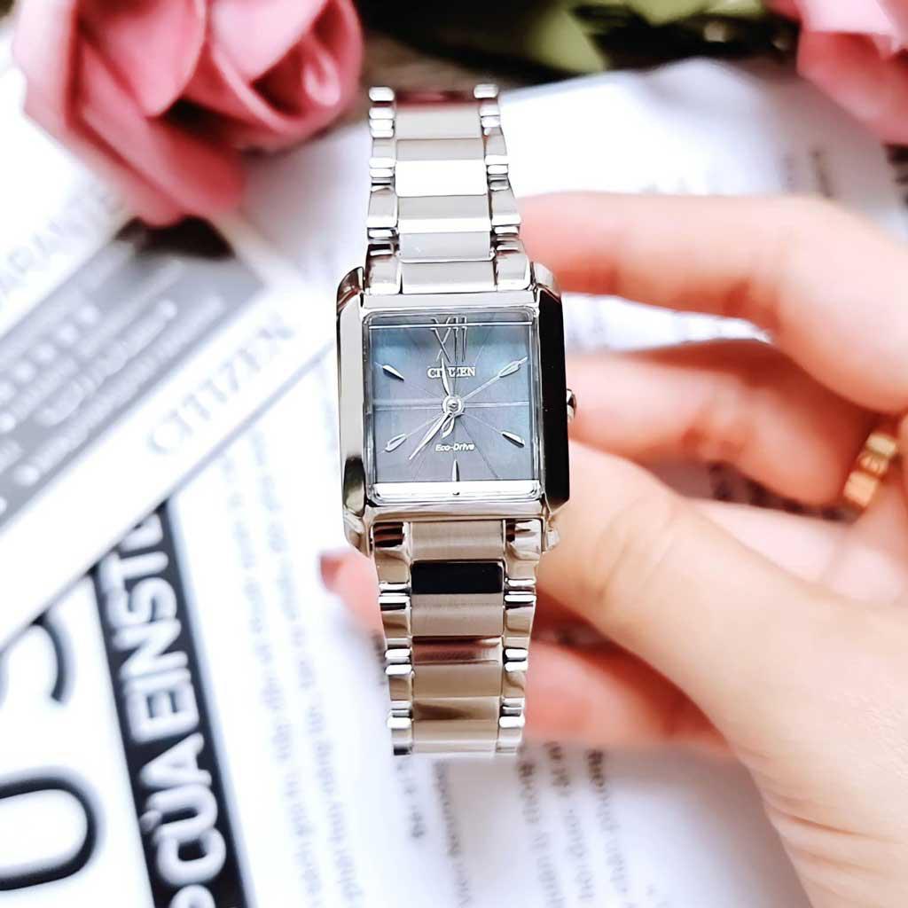 - Bộ máy eco-drive bền bỉ - tự xạc bằng ánh sáng, không cần thay pin trọn đời sp, mặt khảm trai, cọc số la mã, dáng chữ nhật basic, chốt khoá bấm dễ dàng tháo mở