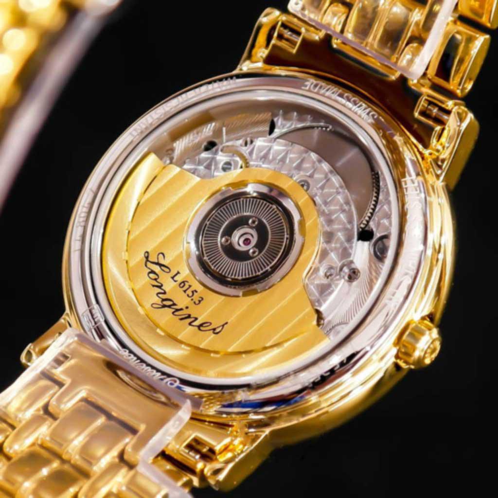 Lật mặt sau chiếc đồng hồ, chúng ta có thể quan sát bộ máy tự động (automatic) mang mã hiệu Longines Calibre L615.3, khả năng trữ cót 64 tiếng, đạt độ chính xác tối ưu đã được chứng nhận bởi các hội đồng kiểm duyệt đồng hồ tại Thụy Sĩ. Là một sản phẩm cao cấp, bộ máy được trang trí bắt mắt với họa tiết Côtes de Genève và búa văng mạ vàng.
